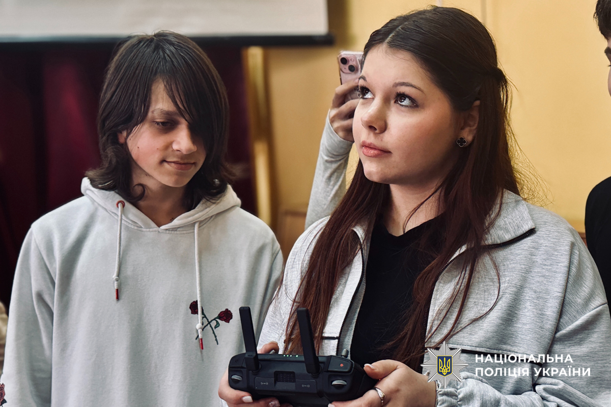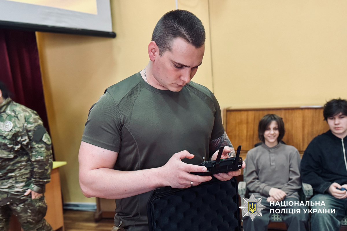 До заходу також долучилися бійці батальйону поліції особливого призначення (стрілецький). Оператор безпілотних літальних апаратів розповів про роботу екіпажів БПЛА, їх підготовку та роль дронів у сучасних умовах. Учні мали змогу не лише побачити екіпірування, а й спробувати себе у ролі операторів, керуючи навчальними дронами.