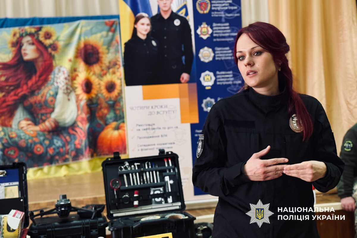 Під час заняття представники сектору організації відбору Управління кадрового забезпечення ознайомили школярів з умовами вступу до закладів вищої освіти системи МВС, розповіли про особливості навчання та перспективи служби в поліції.