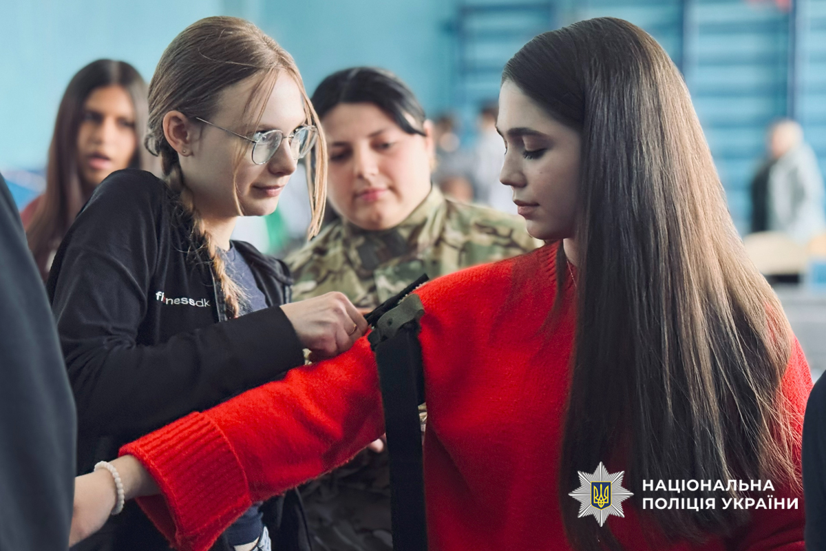 Практичний блок із домедичної допомоги провела медикиня стрілецького батальйону. Вона ознайомила дітей із видами кровотеч та продемонструвала алгоритм накладання турнікета.