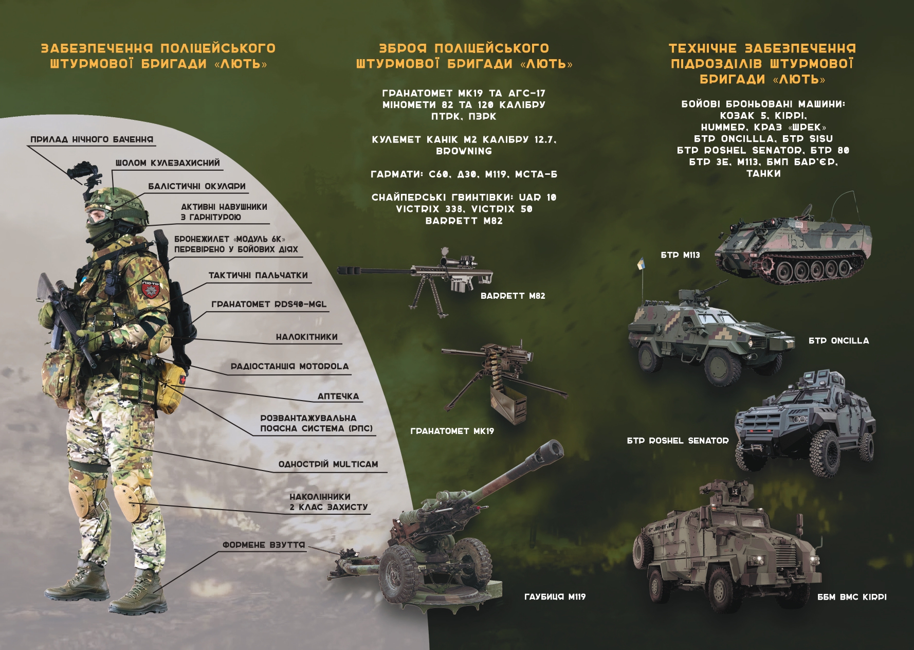 Бригада «Лють» — це три штурмові полки, артилерійський полк і рота спеціальних операцій. В їхньому арсеналі — бронетехніка (БМП, БТР, КОЗАК), артилерійське, зенітне, протитанкове та снайперське озброєння.