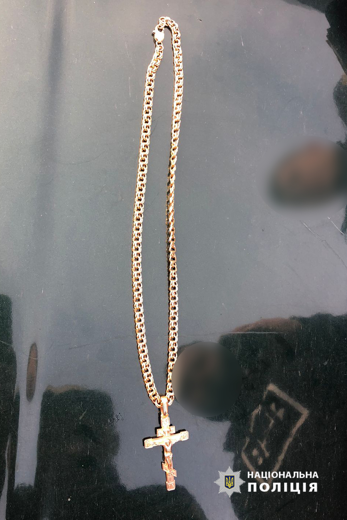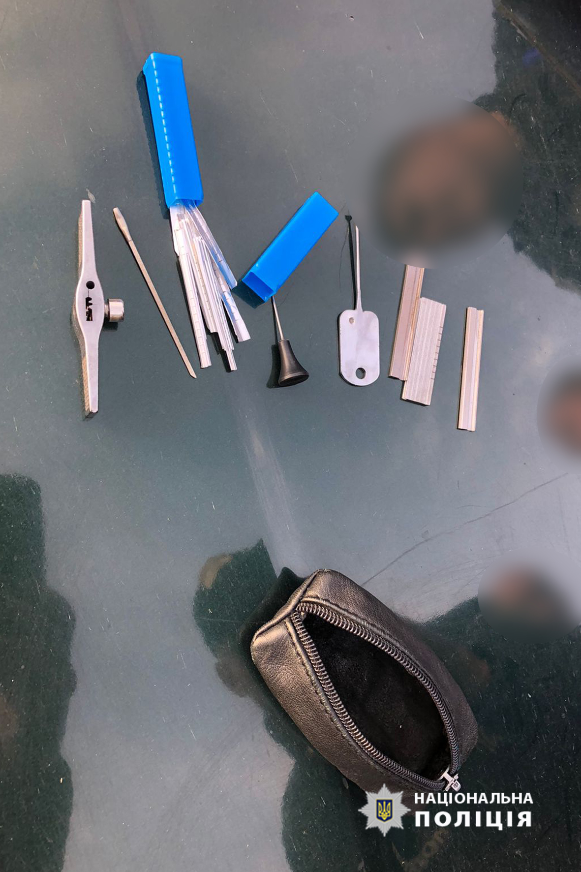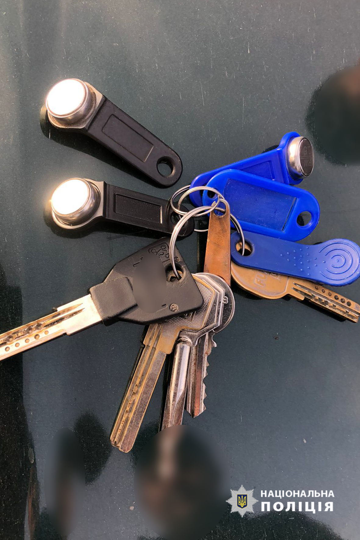 Під час обшуку у зловмисників правоохоронці вилучили грошові кошти в сумі близько 25 100 гривень, банківські картки, два золотих ланцюжки, жіноче золоте кільце, золотий хрестик, набір відмичок для замків, чотири електронних ключі від домофона та товарний чек з ломбарду.
