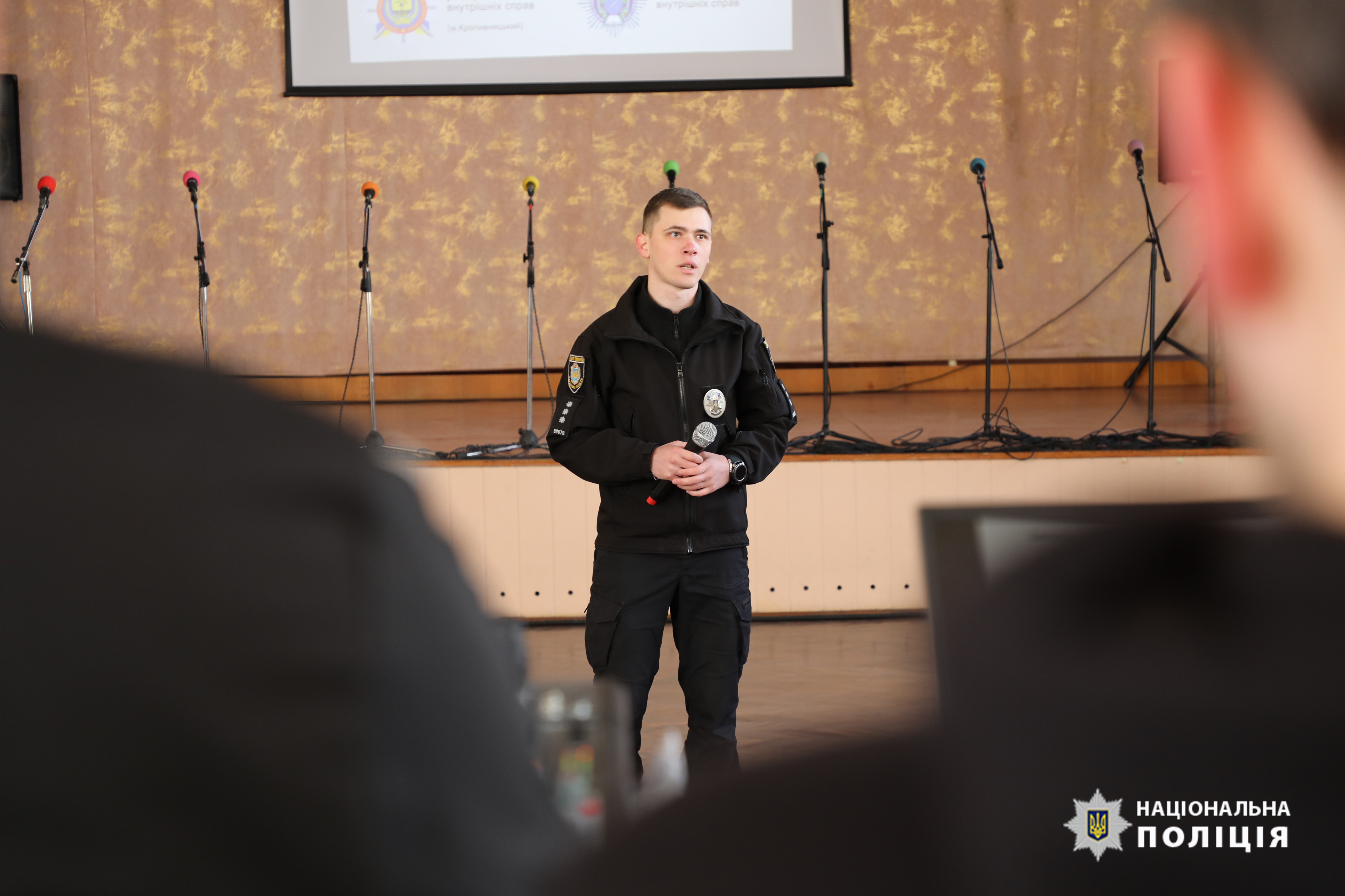 Про особливості служби в поліції та правила вступу до вищих навчальних закладів системи МВС розповіли старшокласникам представники управління кадрового забезпечення ГУНП в Черкаській області та Харківського національного університету внутрішніх справ.