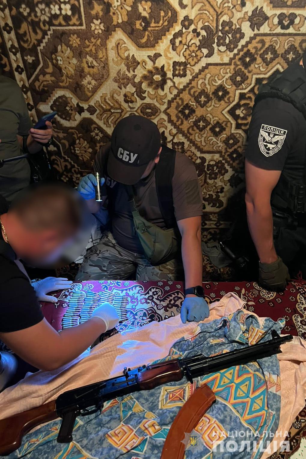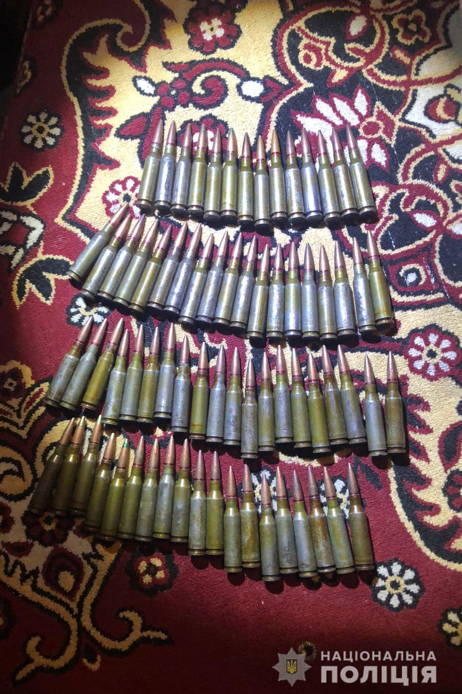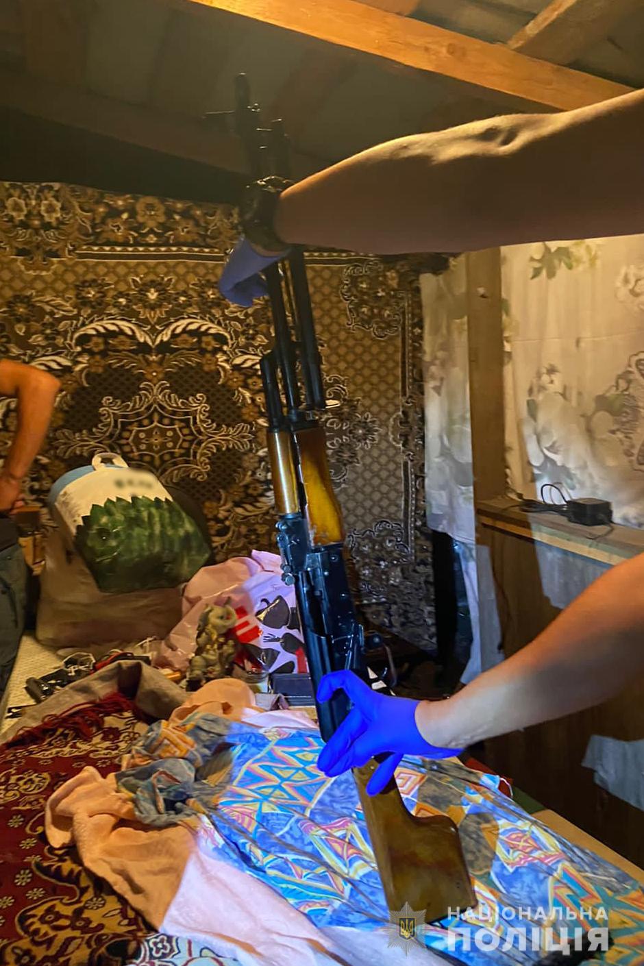 Під час обшуку працівники поліції виявили та вилучили предмет зовні схожий на ручний кулемет «РПК» з магазином, близько 72 набої калібру 5,45 мм, 10 корпусів від гранати «Ф-1» та 10 запалів до них.