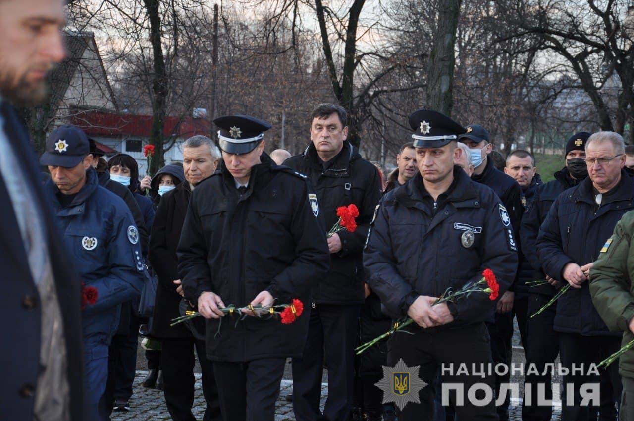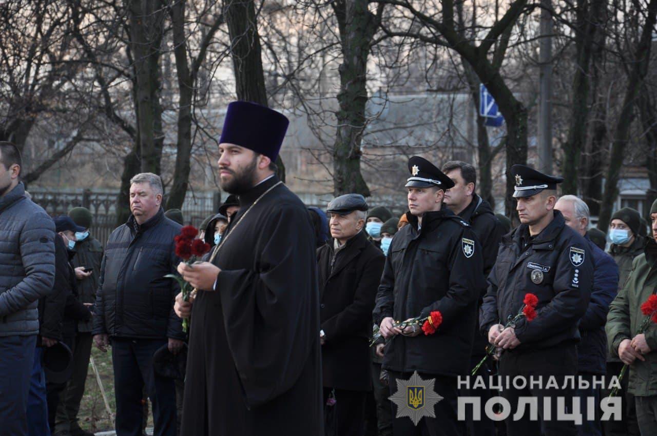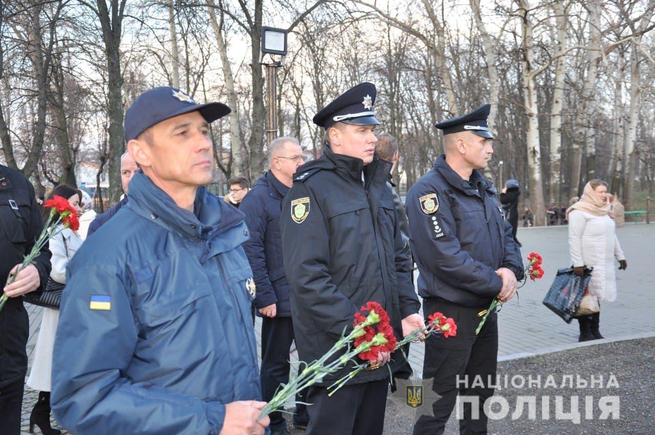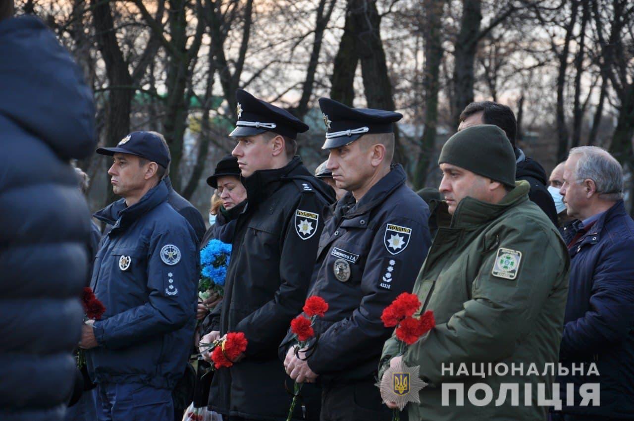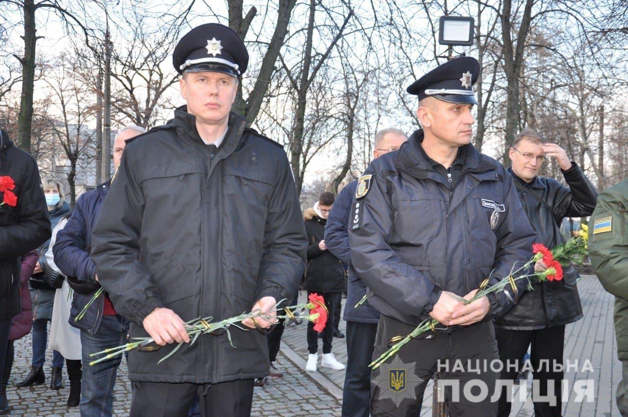Сьогодні пам’ять жертв голодоморів вшановують усі правоохоронці. До Соборного скверу прийшли заступник начальника підполковник поліції Олександр Резцов та начальник управління кадрового забезпечення полковник поліції Іван Давиденко.