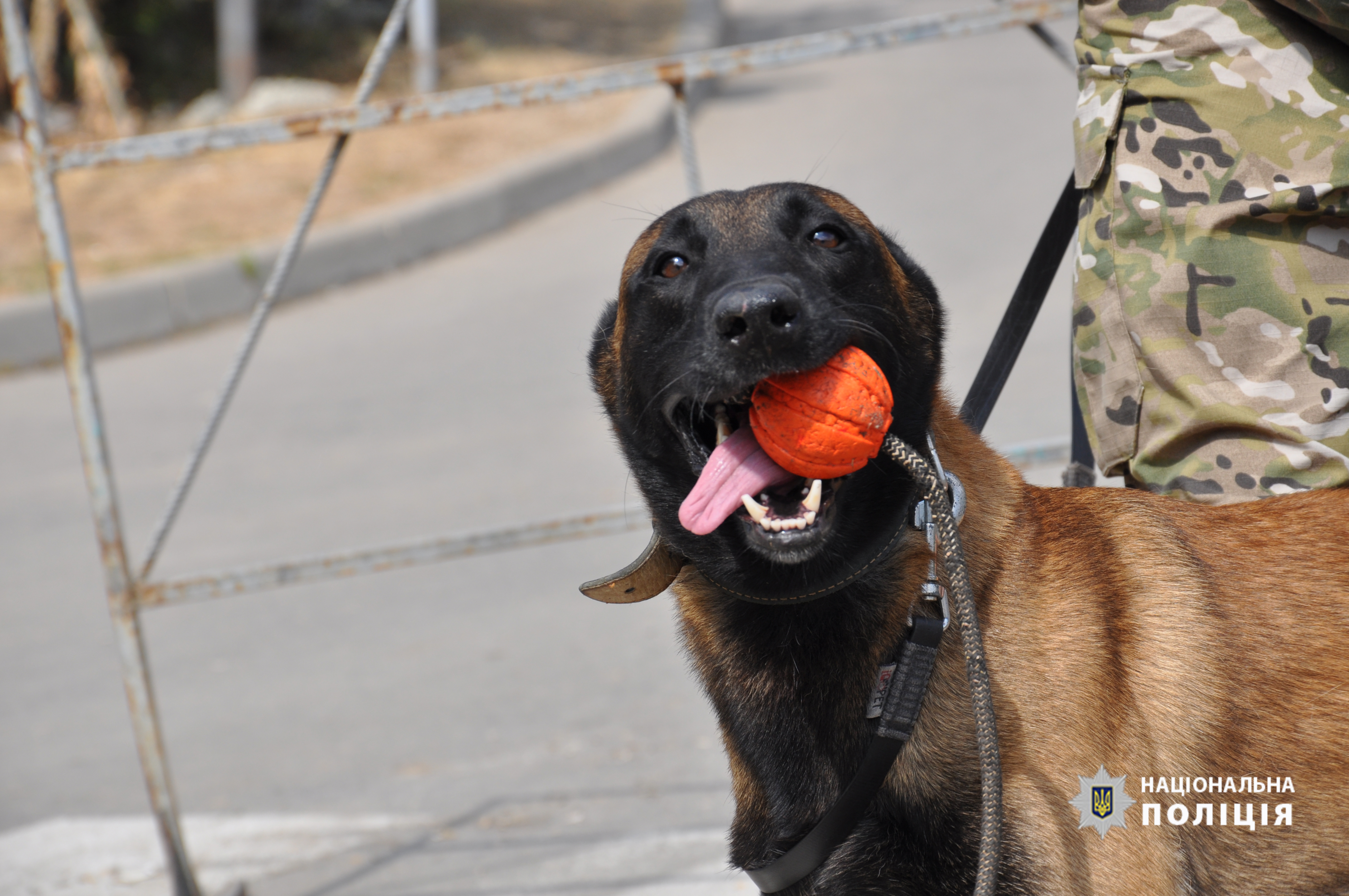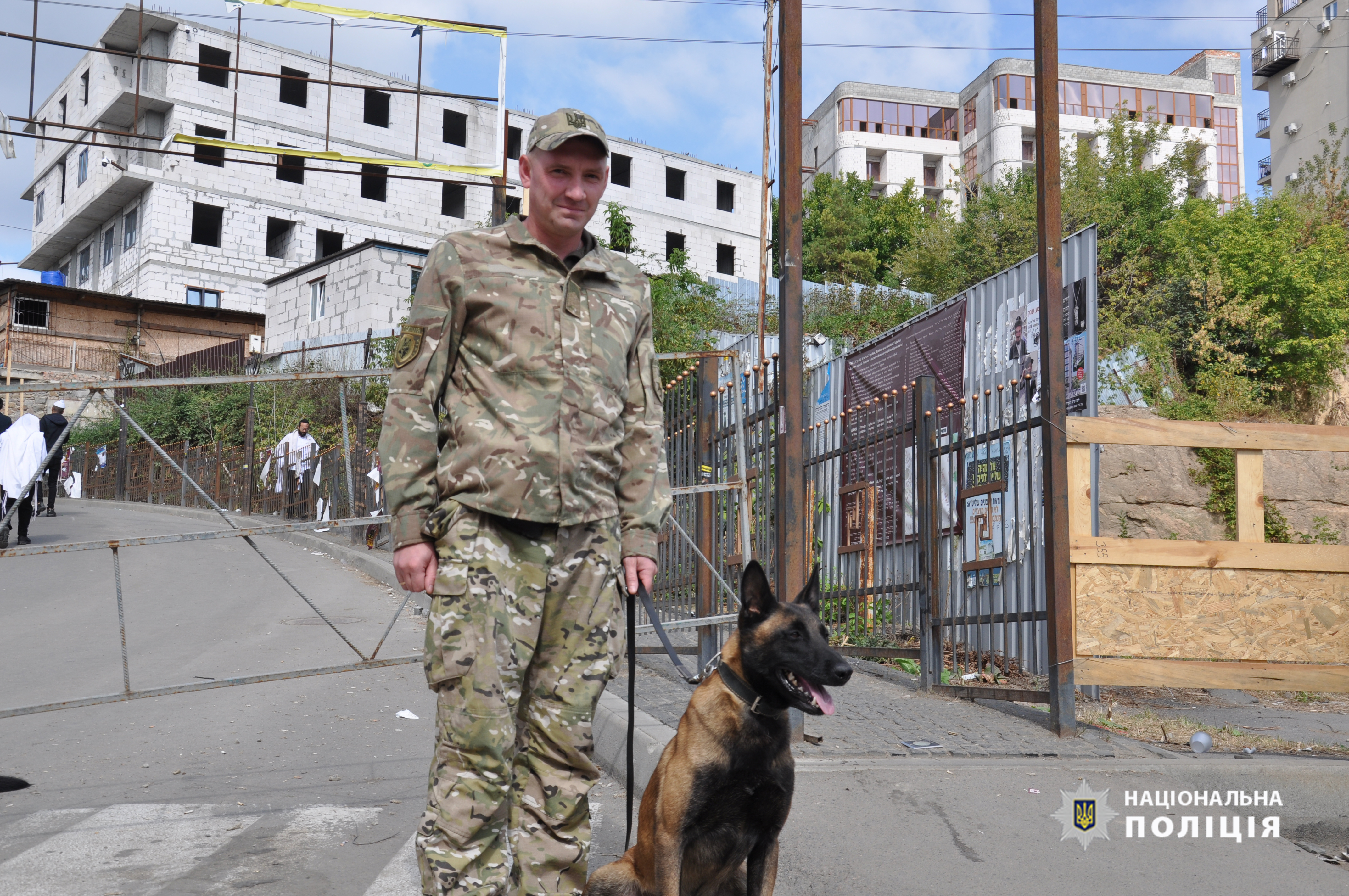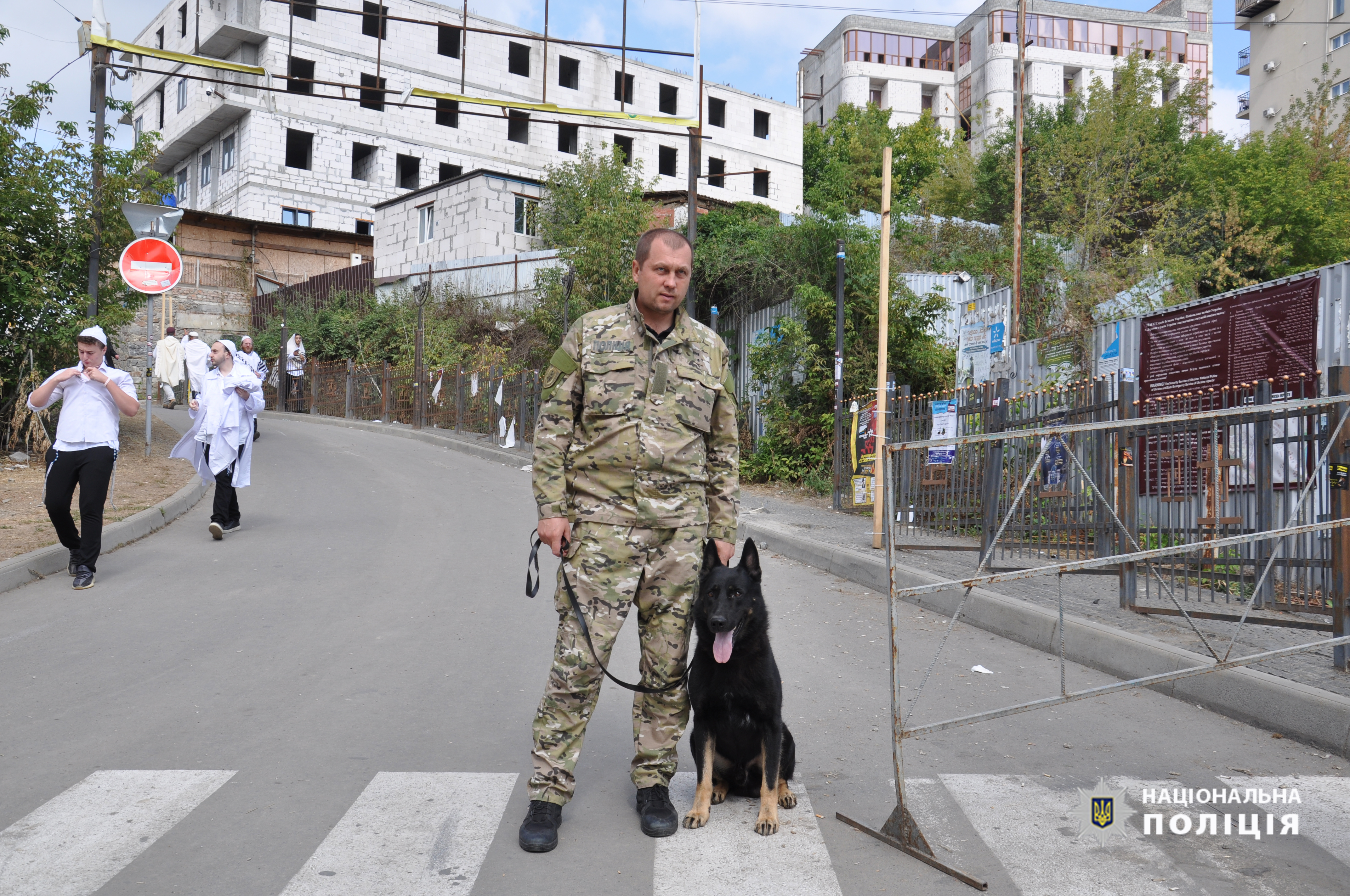 Службові собаки допомагають виявляти заборонені речі. Вони працювали й на контрольно-пропускних пунктах, а зараз патрулюють район компактного перебування паломників хасидів.