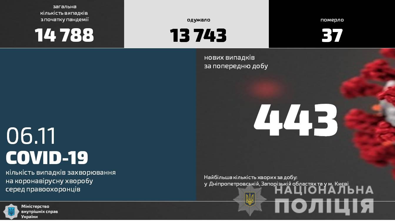 За добу зареєстровано 443 нові випадки коронавірусної хвороби серед працівників МВС.