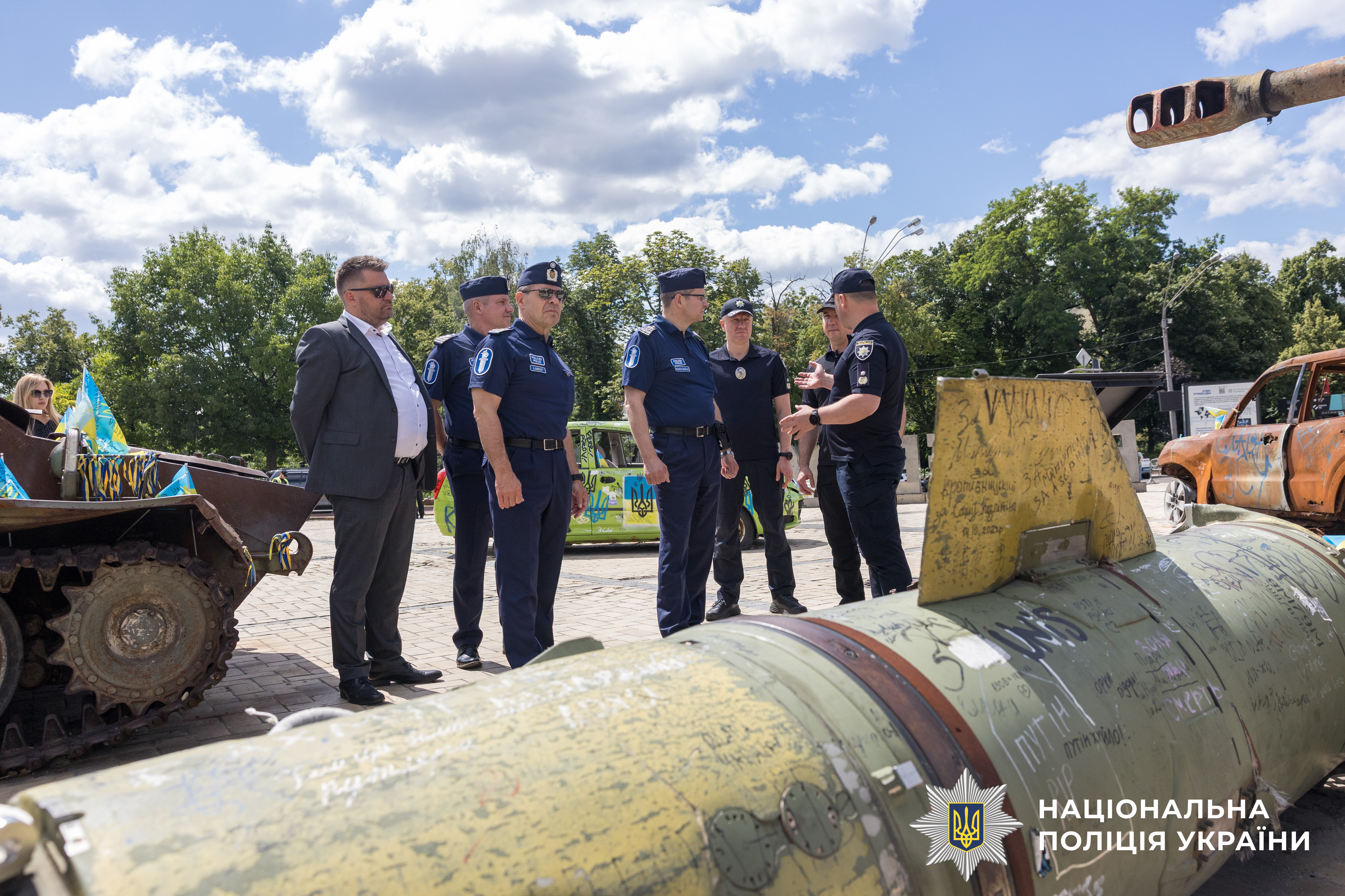During their visit, the foreign delegation and the leadership of the Ukrainian police laid fresh flowers at the “Wall of Memory” of fallen police officers and war heroes who gave their lives for Ukraine. Next, they visited Mykhailivska Square in Kyiv, where they inspected the destroyed enemy vehicles.