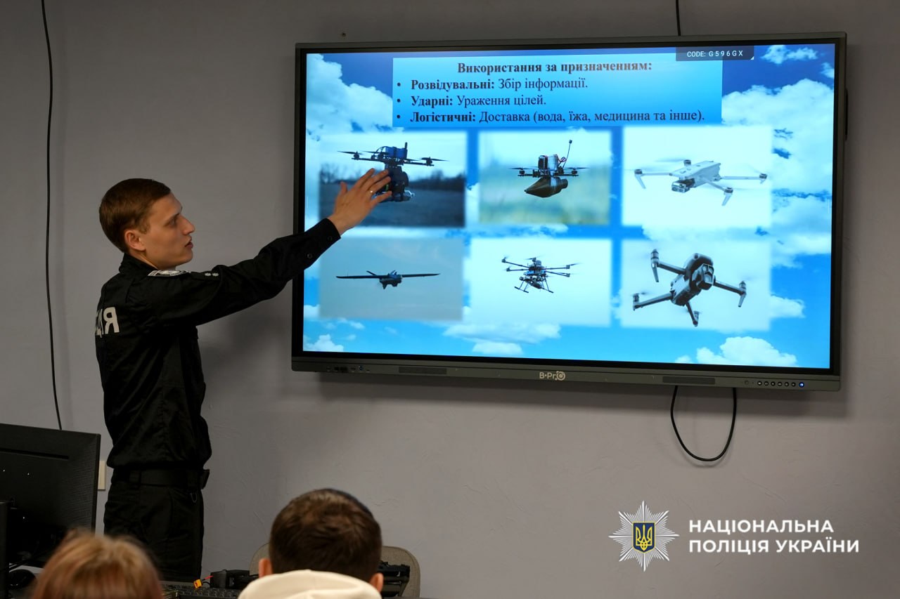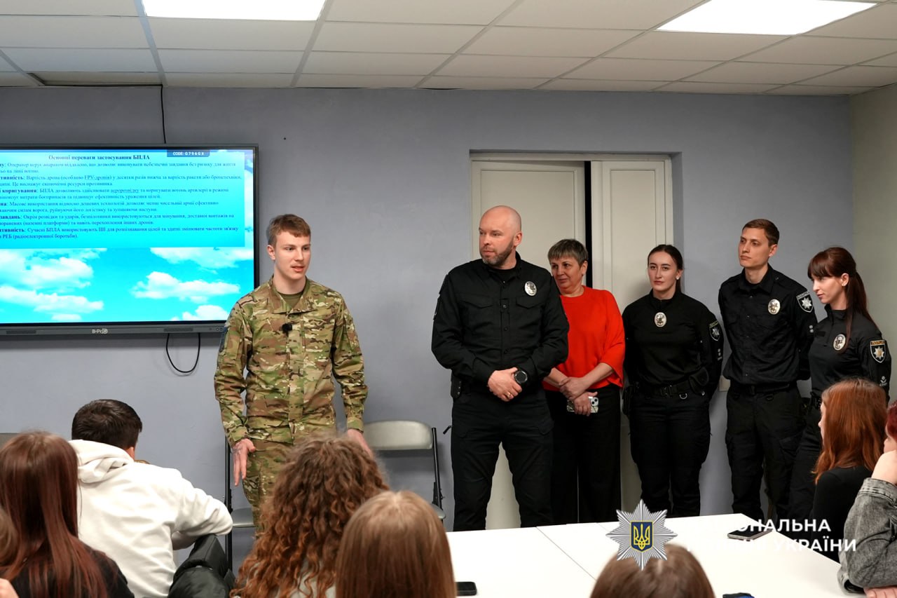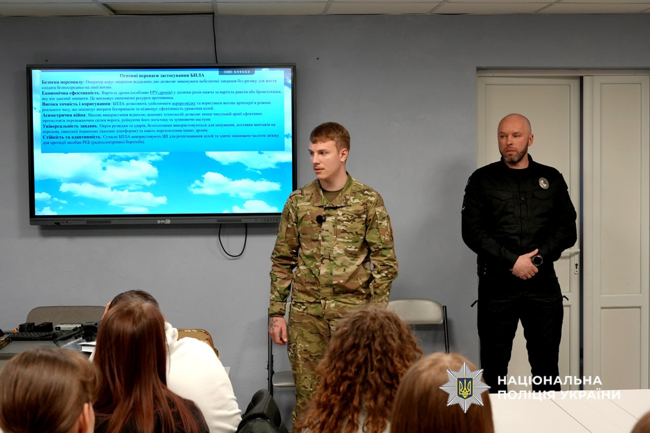 Оператор БПЛА стрілецького батальйону поліції детально розповів про роль дронів у сучасних боях, підготовку екіпажів та важливість технічної освіти для майбутніх військових і правоохоронців. Учні дізналися про участь бійців в евакуації цивільного населення та допомогу людям у зонах активних бойових дій.