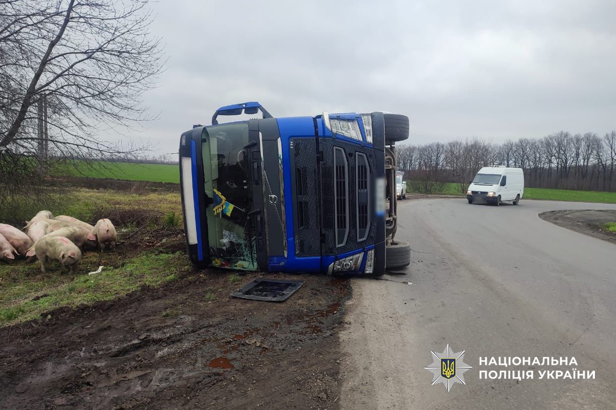 У Христинівці перекинулась вантажівка зі свиньми. Внаслідок ДТП тварини випали з напівпричепа. Транспортний засіб зазнав механічних пошкоджень. Поліцейські склали адміністративні матеріали.
