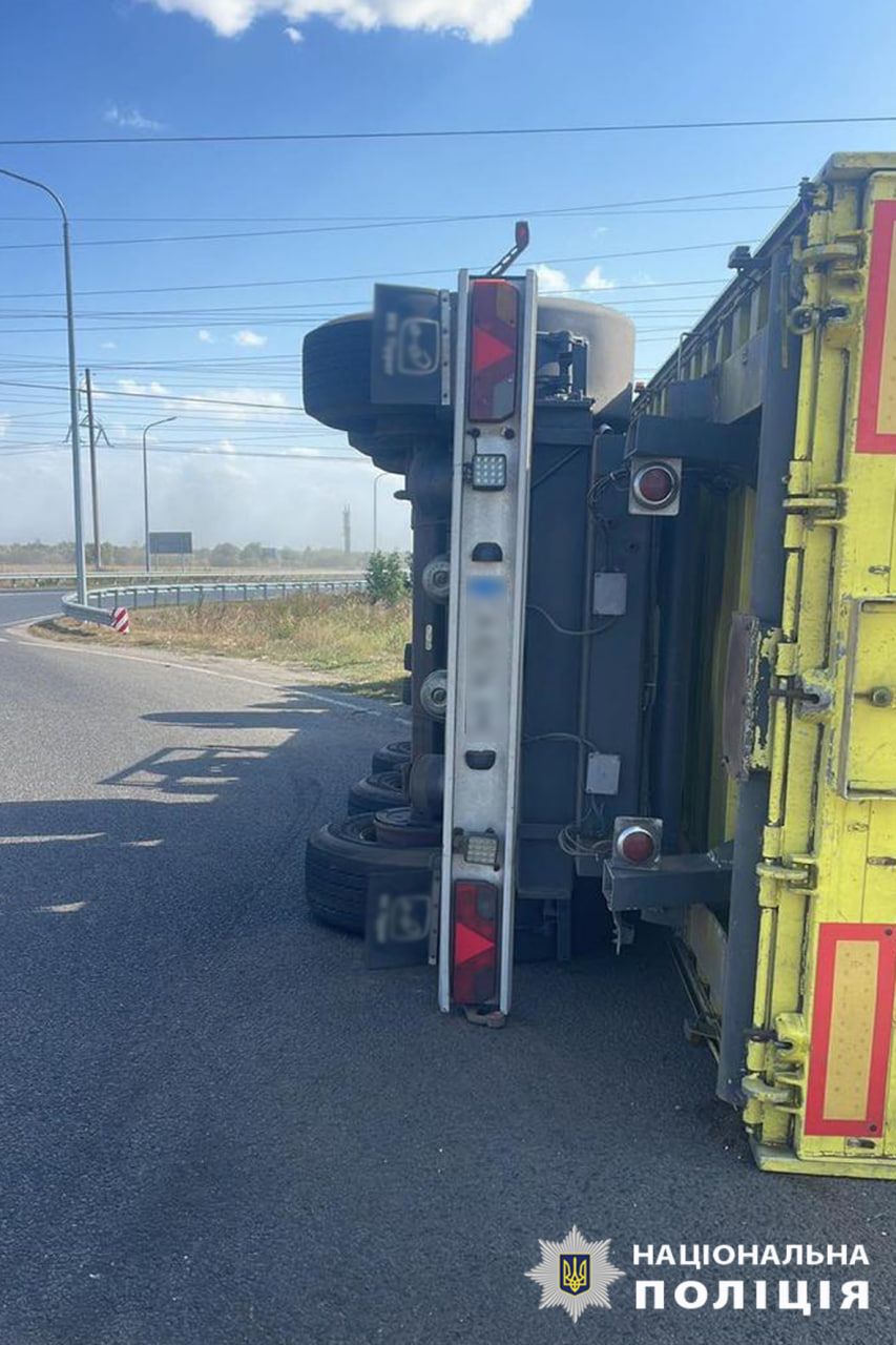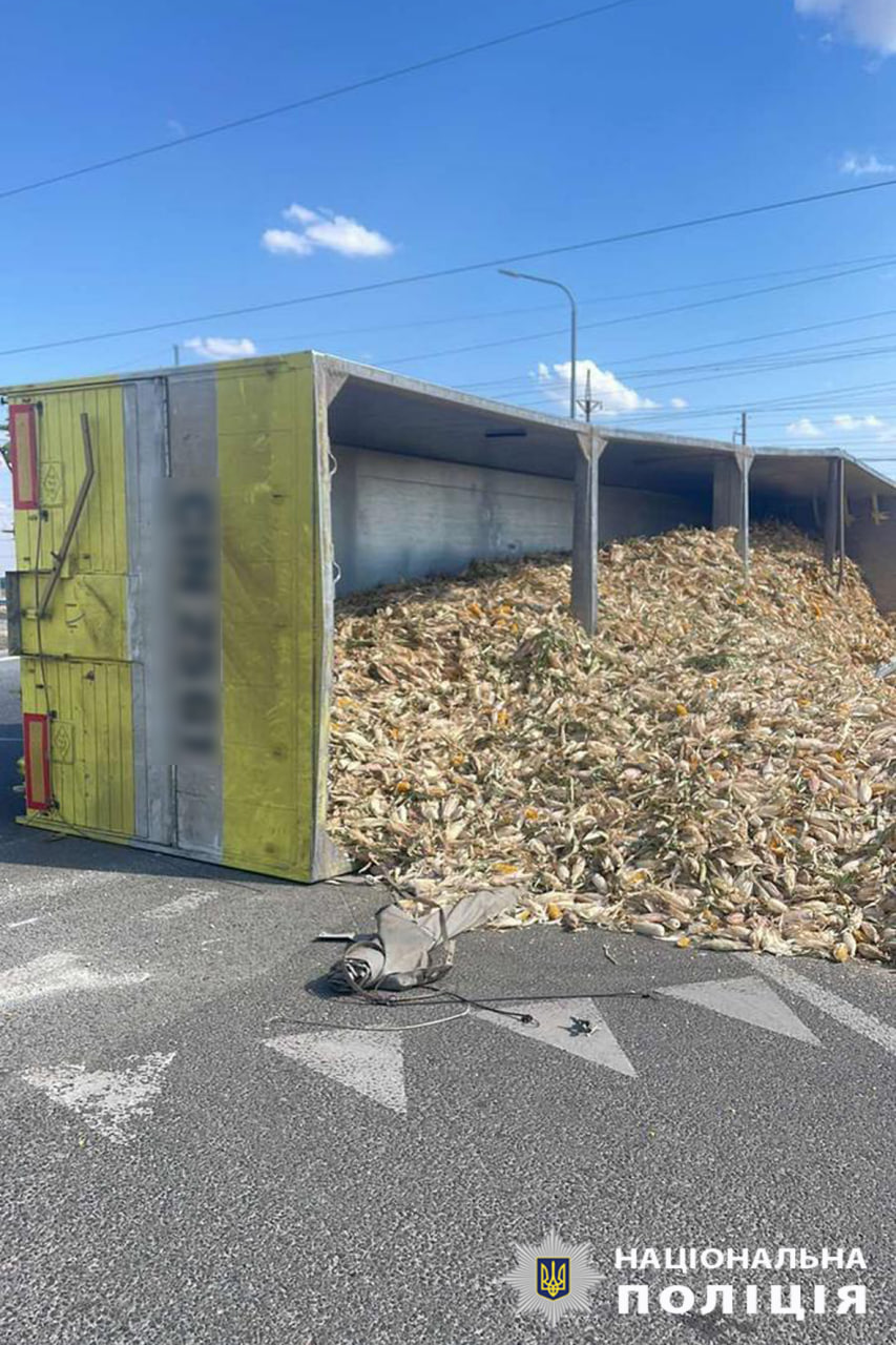На Золотоніщині внаслідок ДТП перекинулася вантажівка з кукурудзою, на місці аварії працюють поліцейські