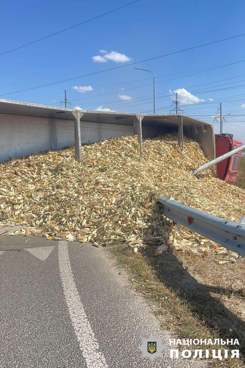 Дорожньо-транспортна пригода сталася сьогодні на автошляху Н-08, неподалік міста Золотоноша. Унаслідок зіткнення з відбійником та електроопорою вантажівка, яка перевозила кукурудзу перекинулася на бік. В автопригоді ніхто не травмувався.