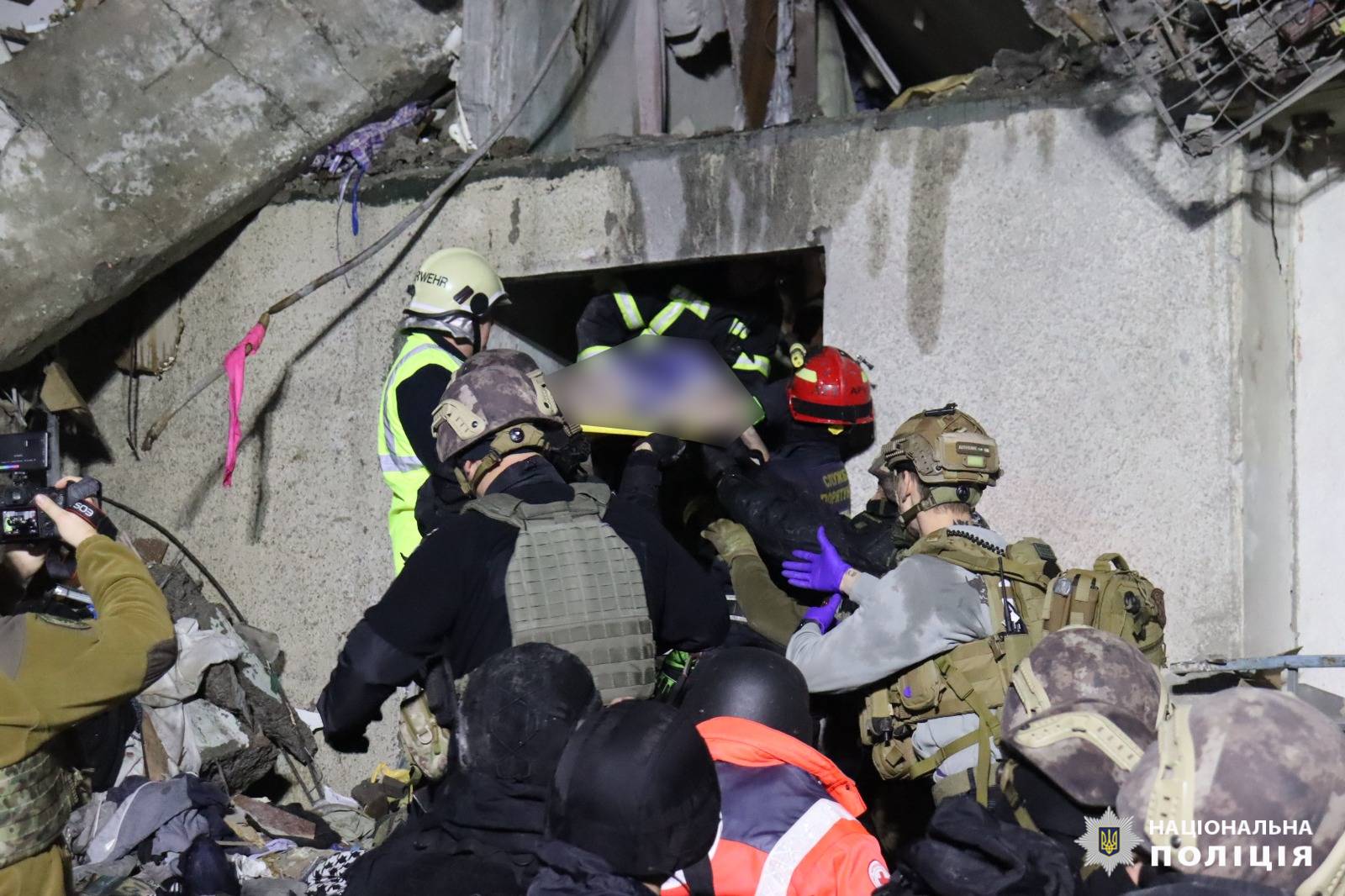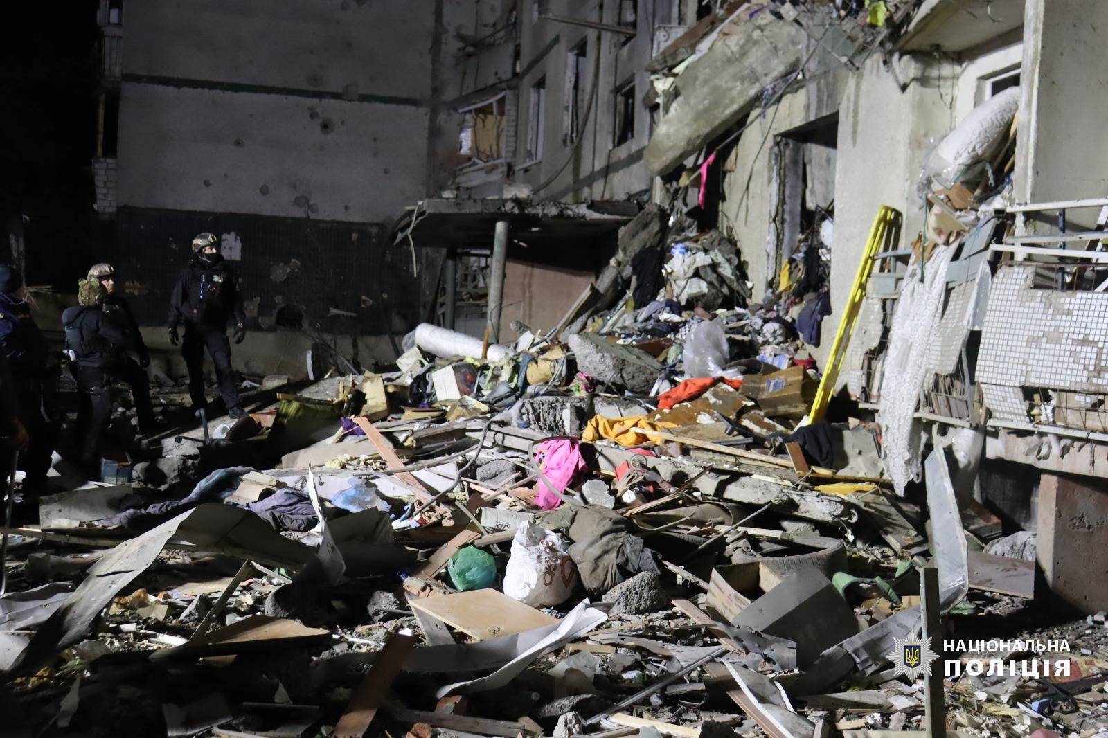 Поряд з місцем влучання розгорнуто роботу оперативного штабу Національної поліції. На 07:15 з заявами про пошкодження майна до працівників поліції звернулися 58 мешканців будинку. Також є заява про зниклу безвісти 15-річну дитину.