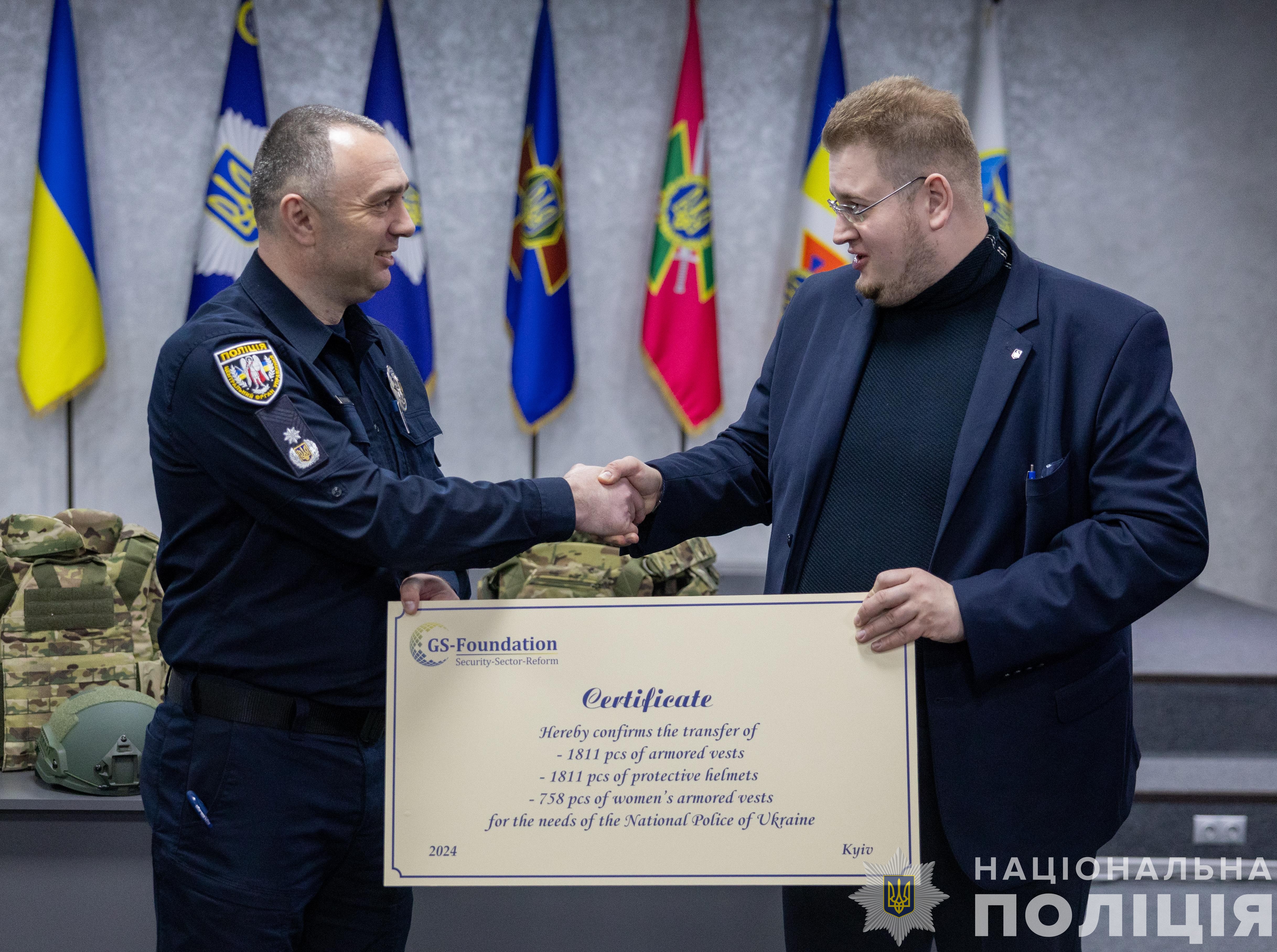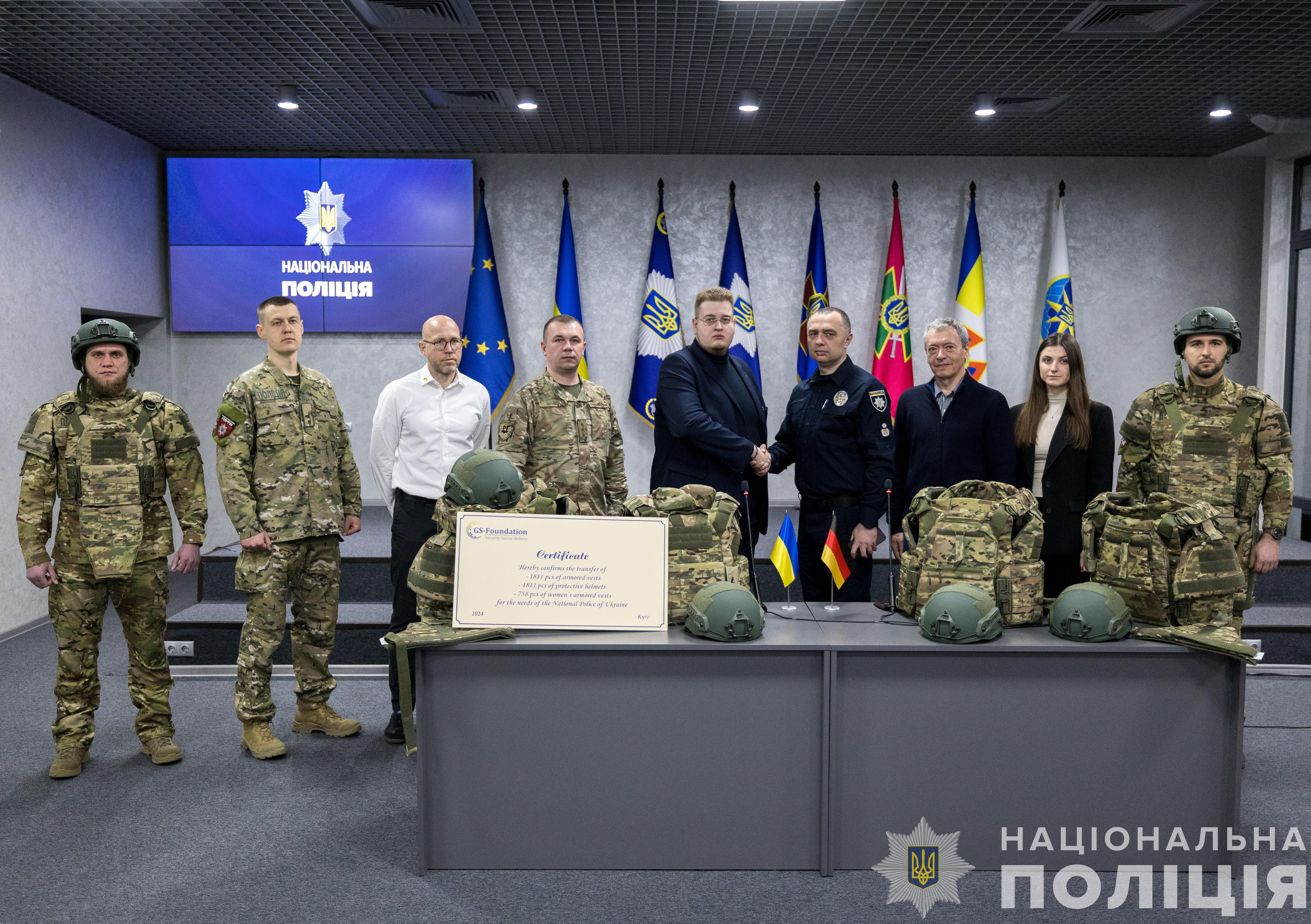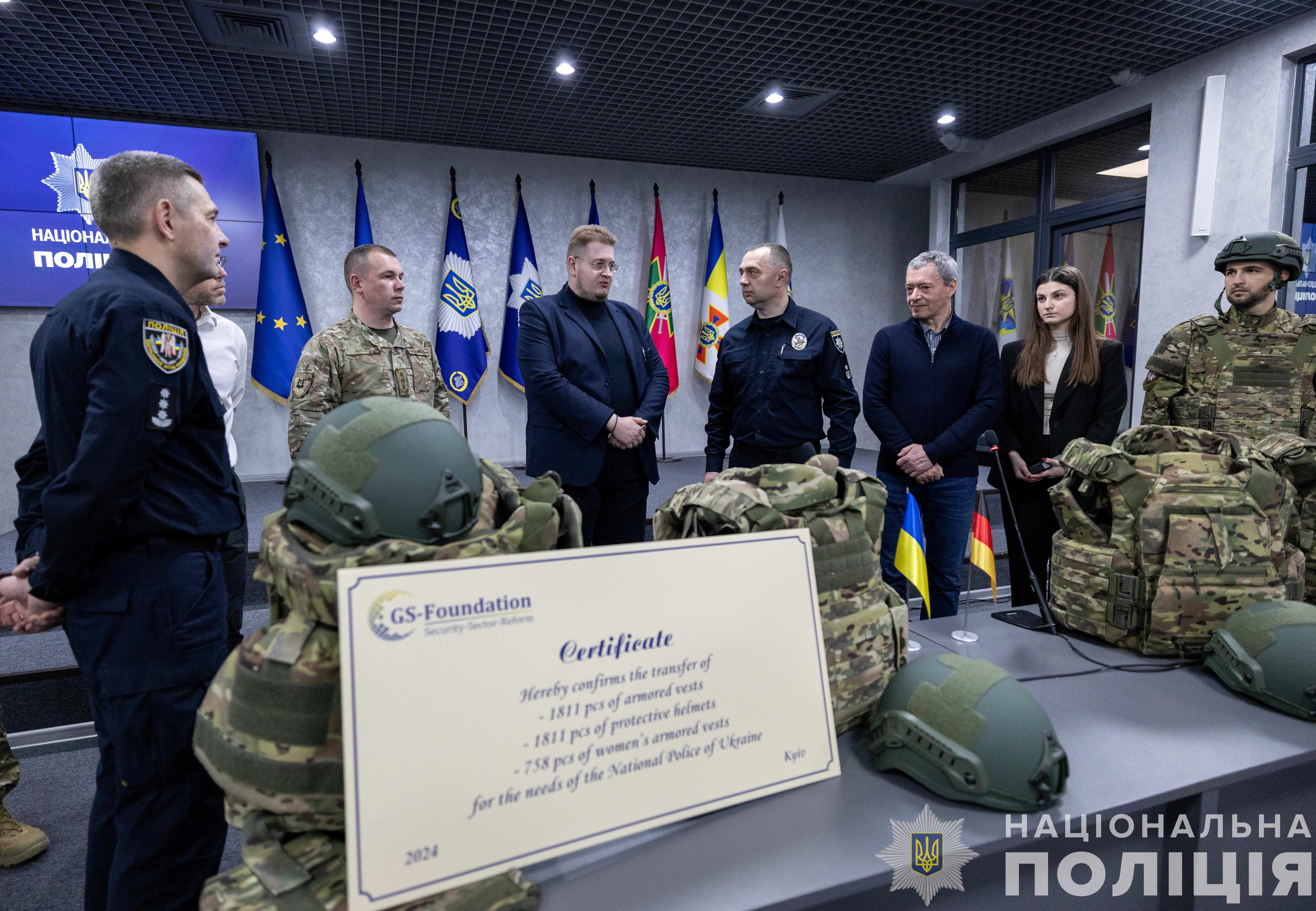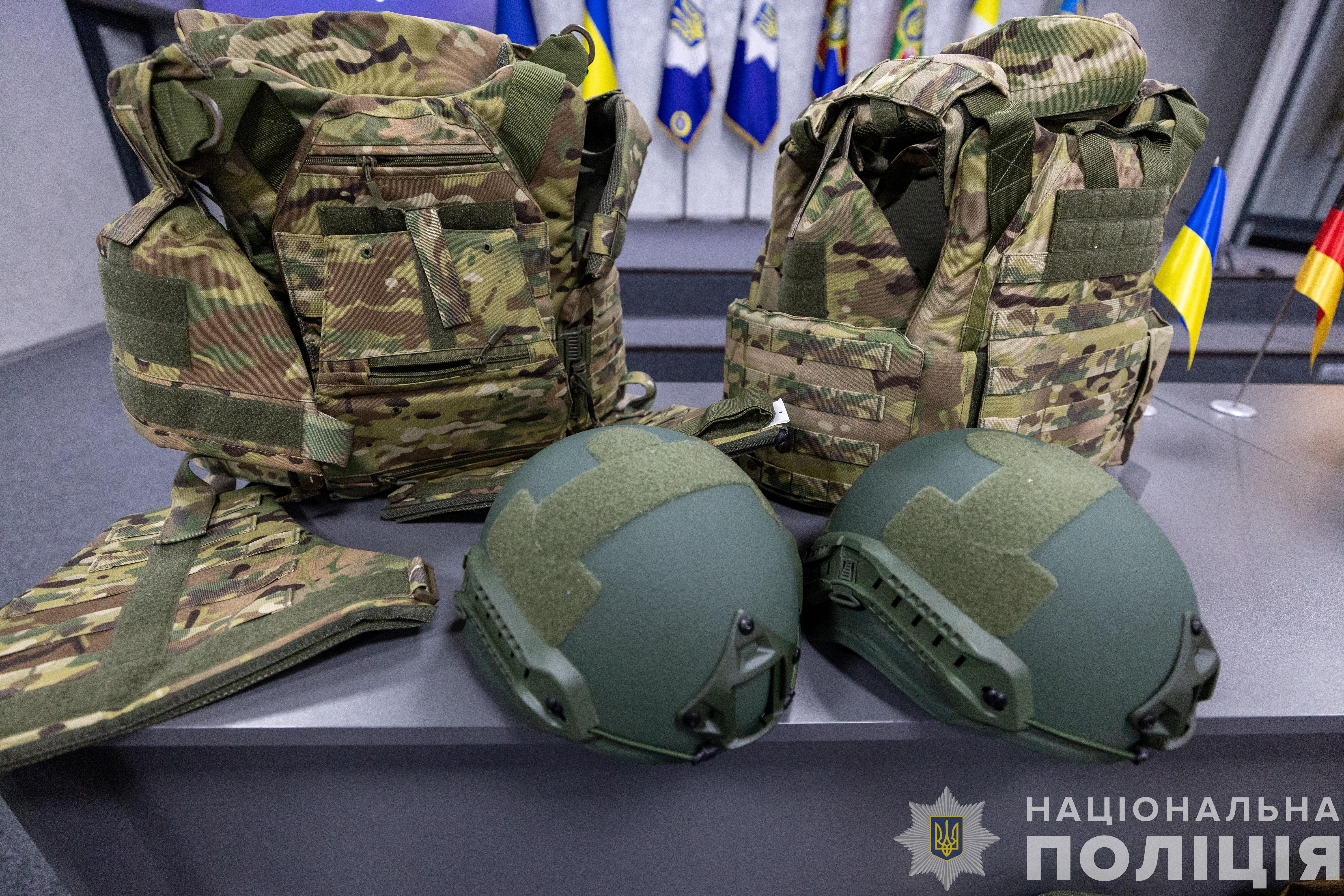 За підтримки Посольства Федеративної Республіки Німеччина в Україні та Глобального фонду реформування сектору безпеки, українські правоохоронці отримали 1811 комплектів чоловічих і 758 спеціалізованих бронежилетів для жінок VІ класу, а також шоломи з додатковим захистом.