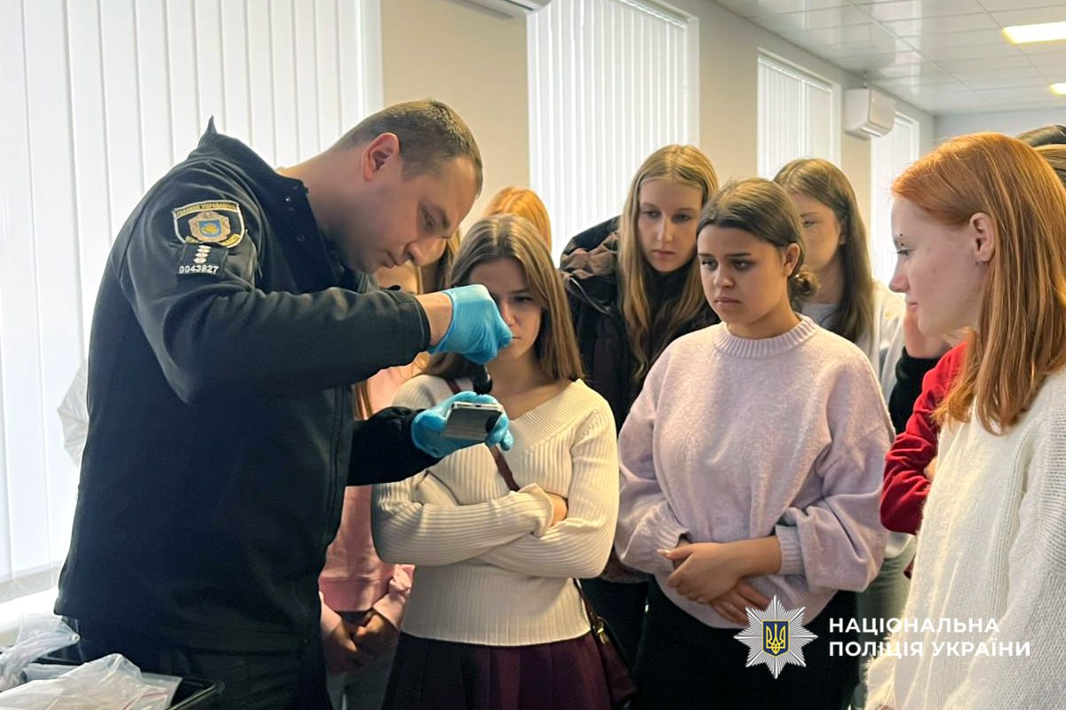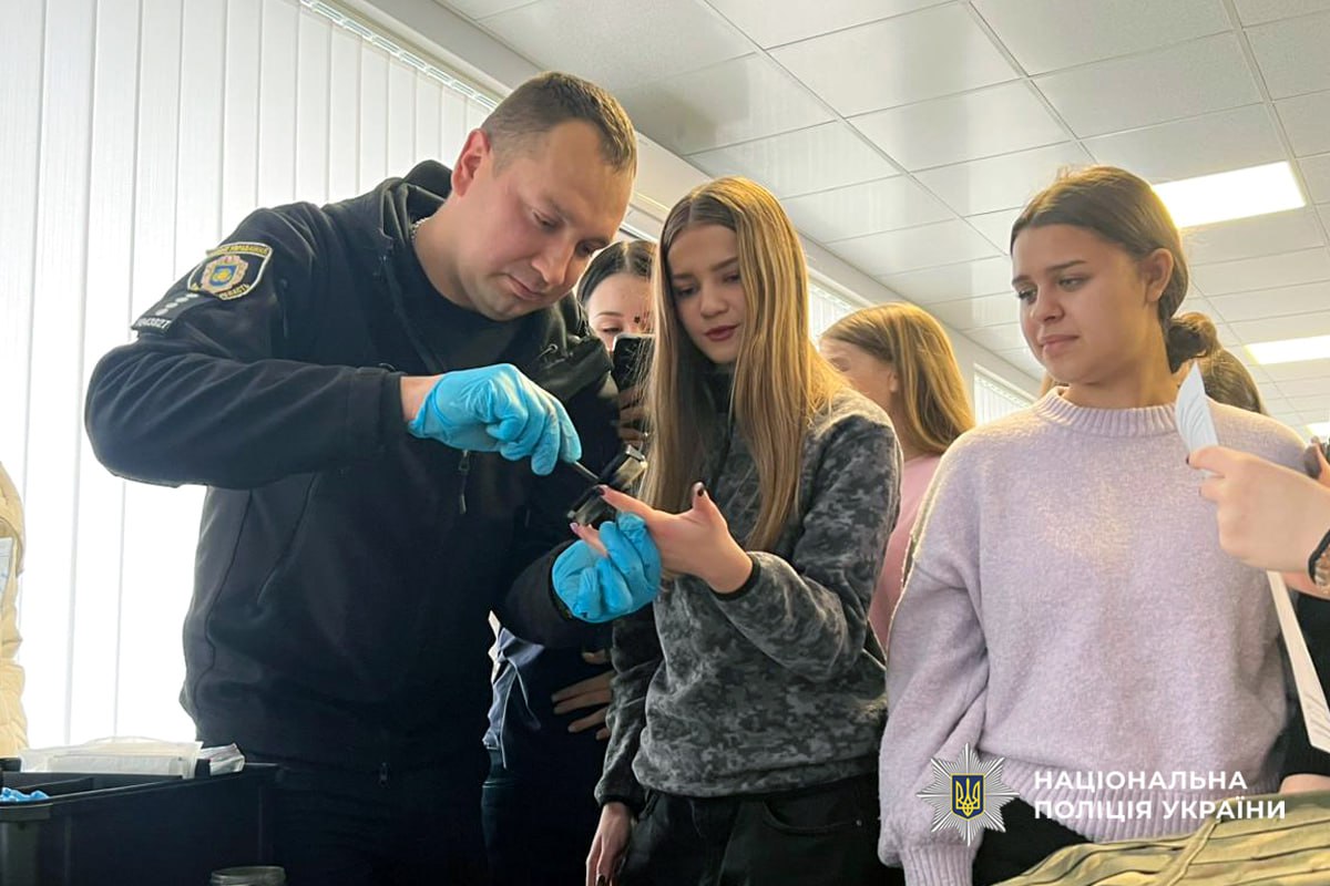 Поліцейський криміналіст поділився зі школярами тонкощами своєї роботи й продемонстрував професійно-технічне обладнання, яке застосовують поліцейські криміналісти у професійній діяльності. Також він провів майстер-клас та показав, як вилучається слідова інформація з місця події.
