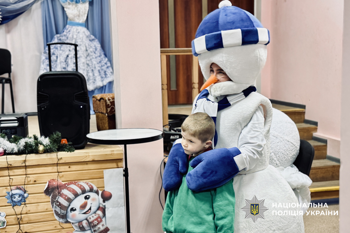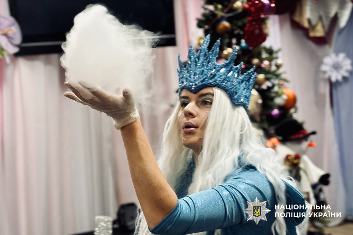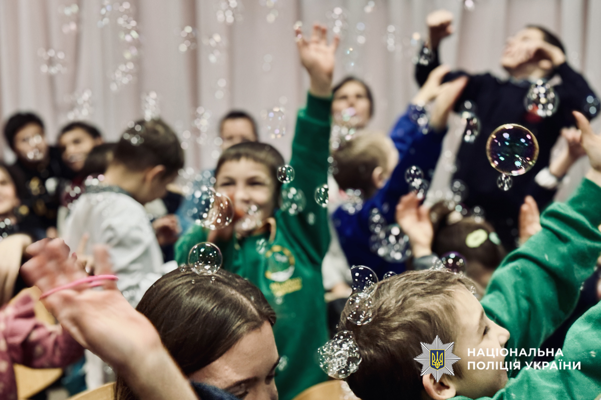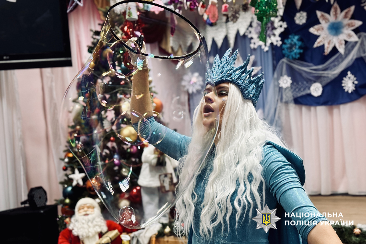 Правоохоронці підготували для дітей не лише подарунки, а й розважальну програму. Для малечі організували яскраве шоу мильних бульбашок. Разом зі Сніговою королевою та Сніговиком вихованці поринули у чарівний казковий світ, сповнений радісних емоцій.
