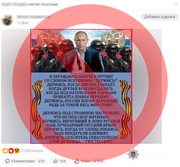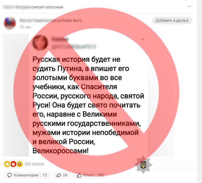 Під час моніторингу мережі інтернет працівниками кіберполіції Черкаської області було виявлено черкащанку, яка в соціальній мережі розповсюджувала публікації, в яких підтримувала агресію рф проти України та пропагувала проросійські настрої.