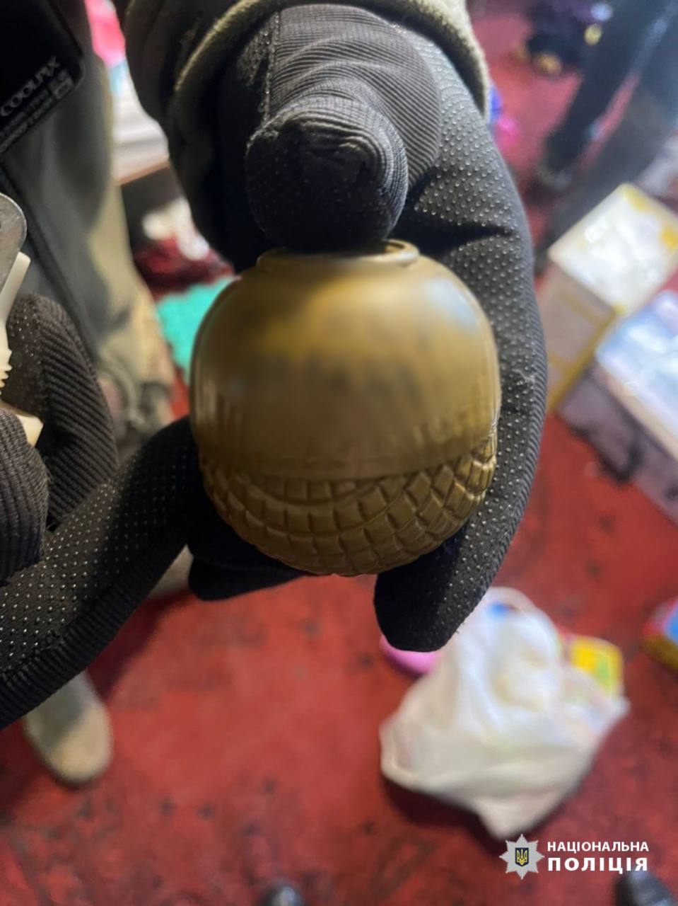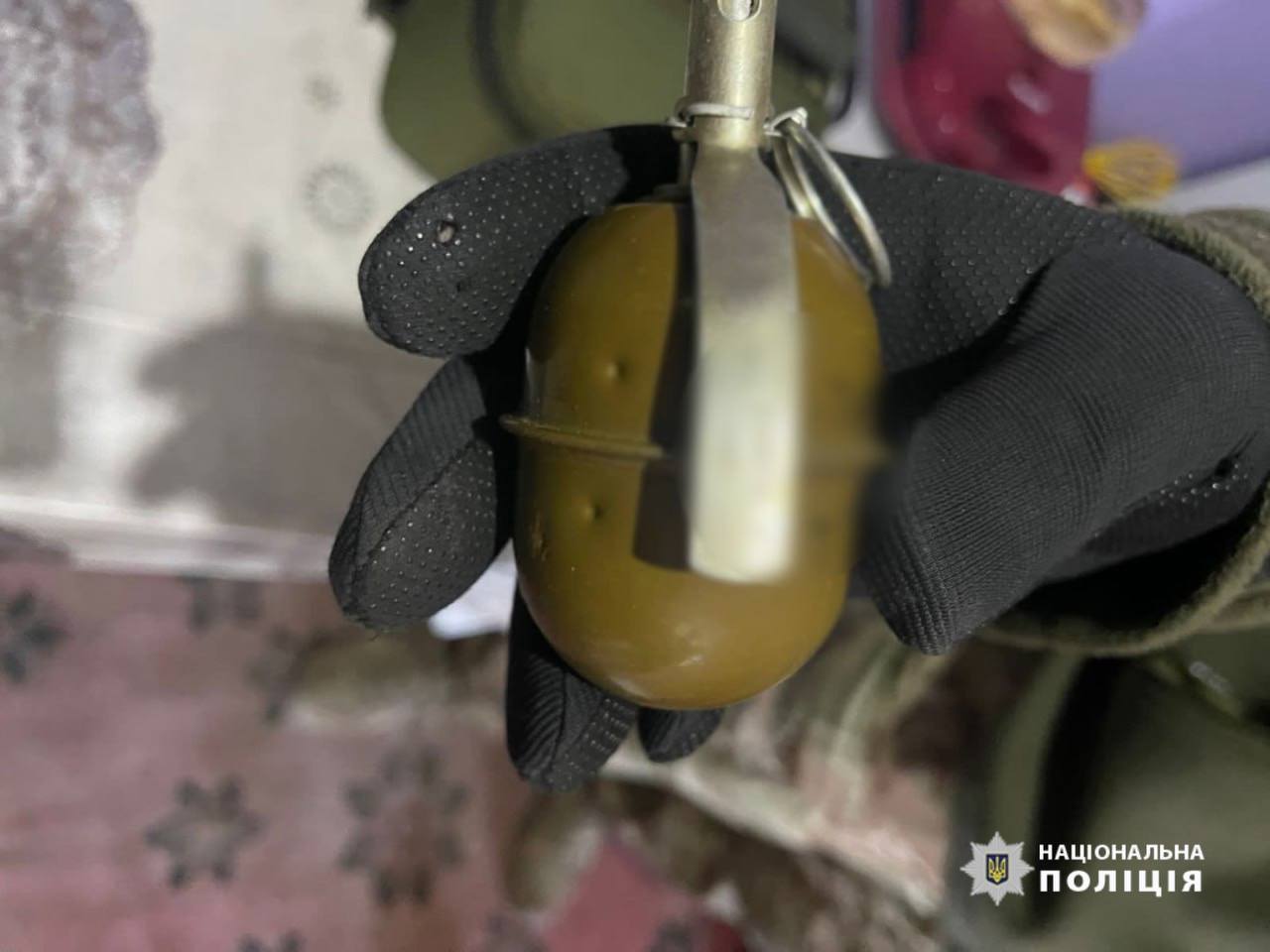 Під час обшуку працівники поліції виявили та вилучили два предмети зовні схожих на гранати «РГД-5» та «РГО» із запалами до них та речовину рослинного походження ймовірно «канабіс».