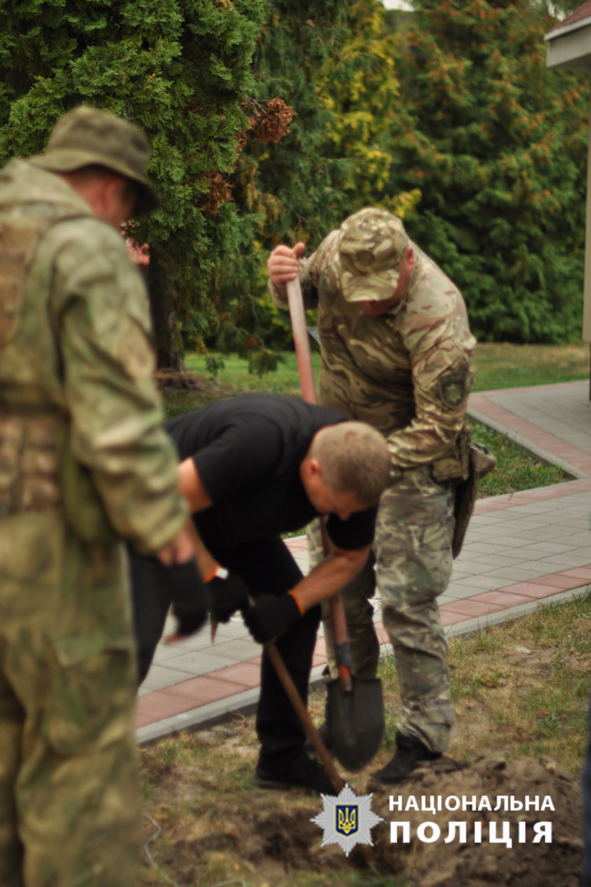 Поліцейські висадили туї, як символ твердості та стійкості, поруч каплиці Покрови Пресвятої Богородиці на території Главку. Загиблих правоохоронців присутні вшанували хвилиною мовчання.
