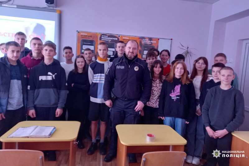 Правоохоронець ознайомив школярів та студентів з поняттям насильства та його формами, розповів, як не стати жертвою подібного явища. Також, поліцейський офіцер наголосив підліткам, що робити та куди звертатись у разі, якщо вони або їх близькі стали жертвами подібного правопорушення.