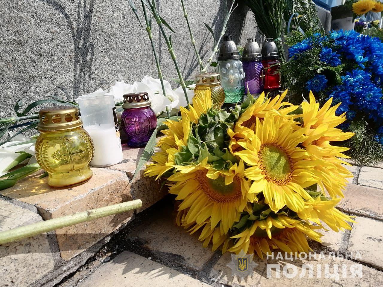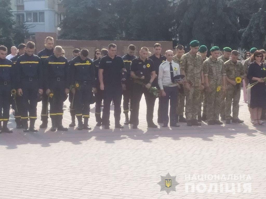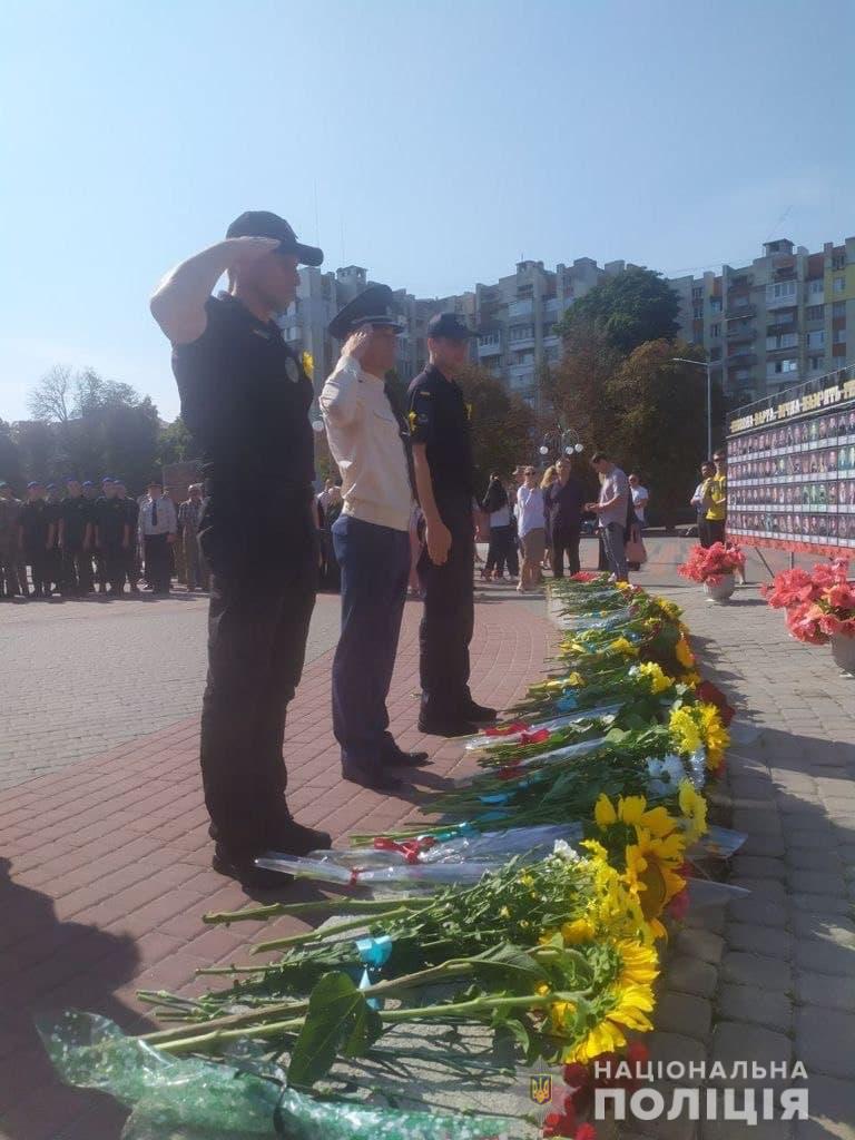 У Черкасах на Площі Слави керівництво поліції області, рятувальники, військові та представники влади поклали квіти до стел із портретами загиблих, зокрема, символічні соняхи.