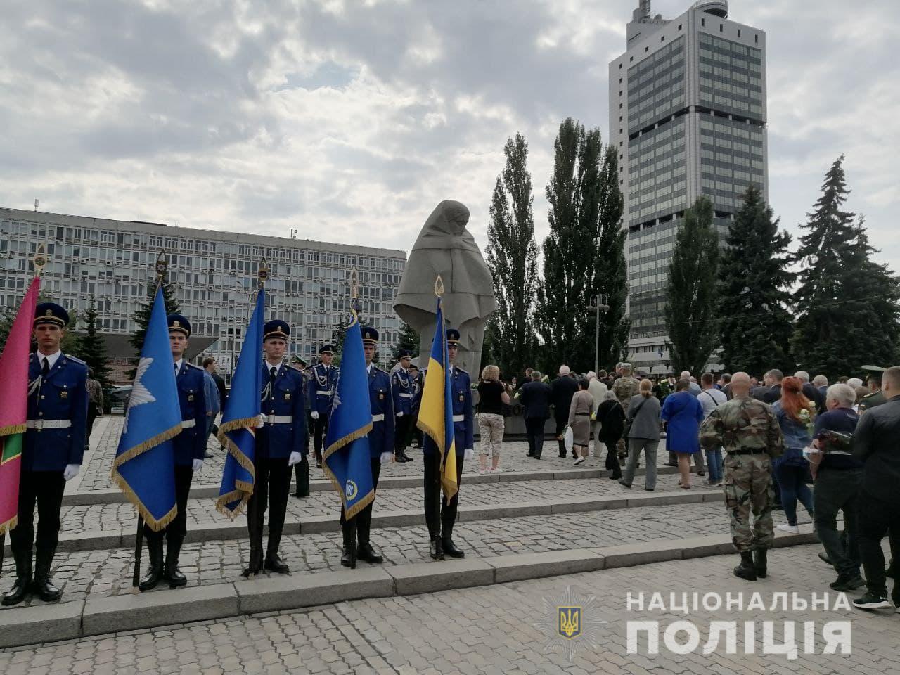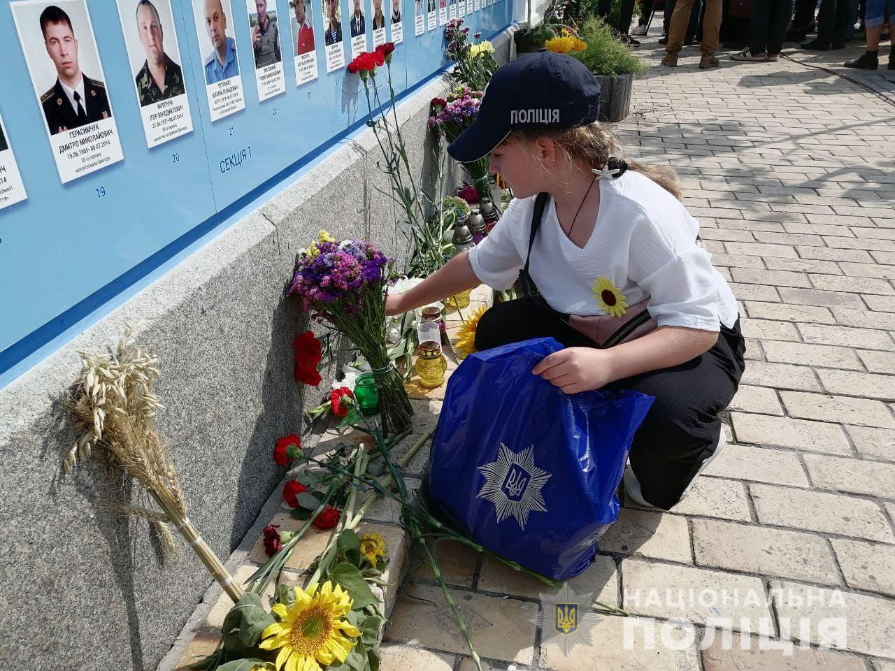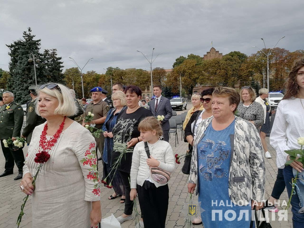 У Черкасах на Площі Слави керівництво поліції області, рятувальники, військові та представники влади поклали квіти до стел із портретами загиблих, зокрема, символічні соняхи.