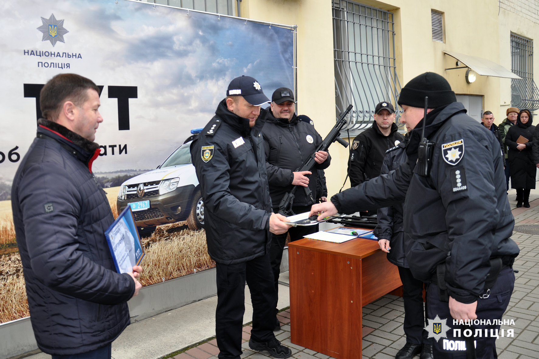 Також сьогодні на службу у Будищанській, Іркліївській, Паланській та Чорнобаївській територіальних громадах заступили поліцейські офіцери, які пройшли навчання та призначені на посади. Вони мають облаштовані місця для роботи, а також службові автомобілі, які укомплектовані всім необхідним: інструментами, бензопилами, ліхтариками, буксирувальними тросами, термопринтерами для винесення постанов та іншим обладнанням для цілодобового виконання обов’язків. Ще поліцейським вручили помпові рушниці.