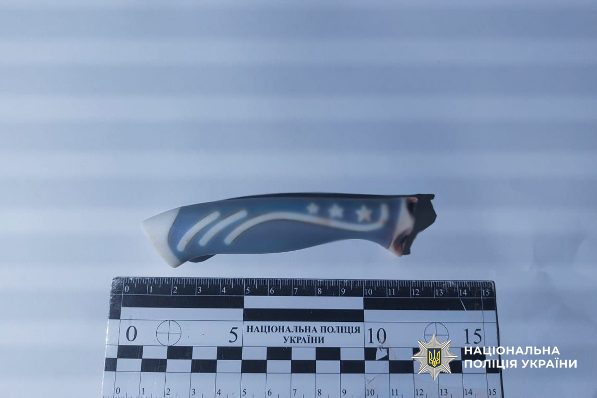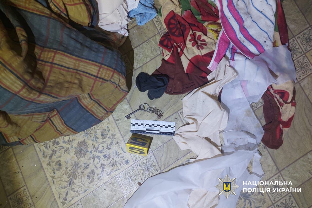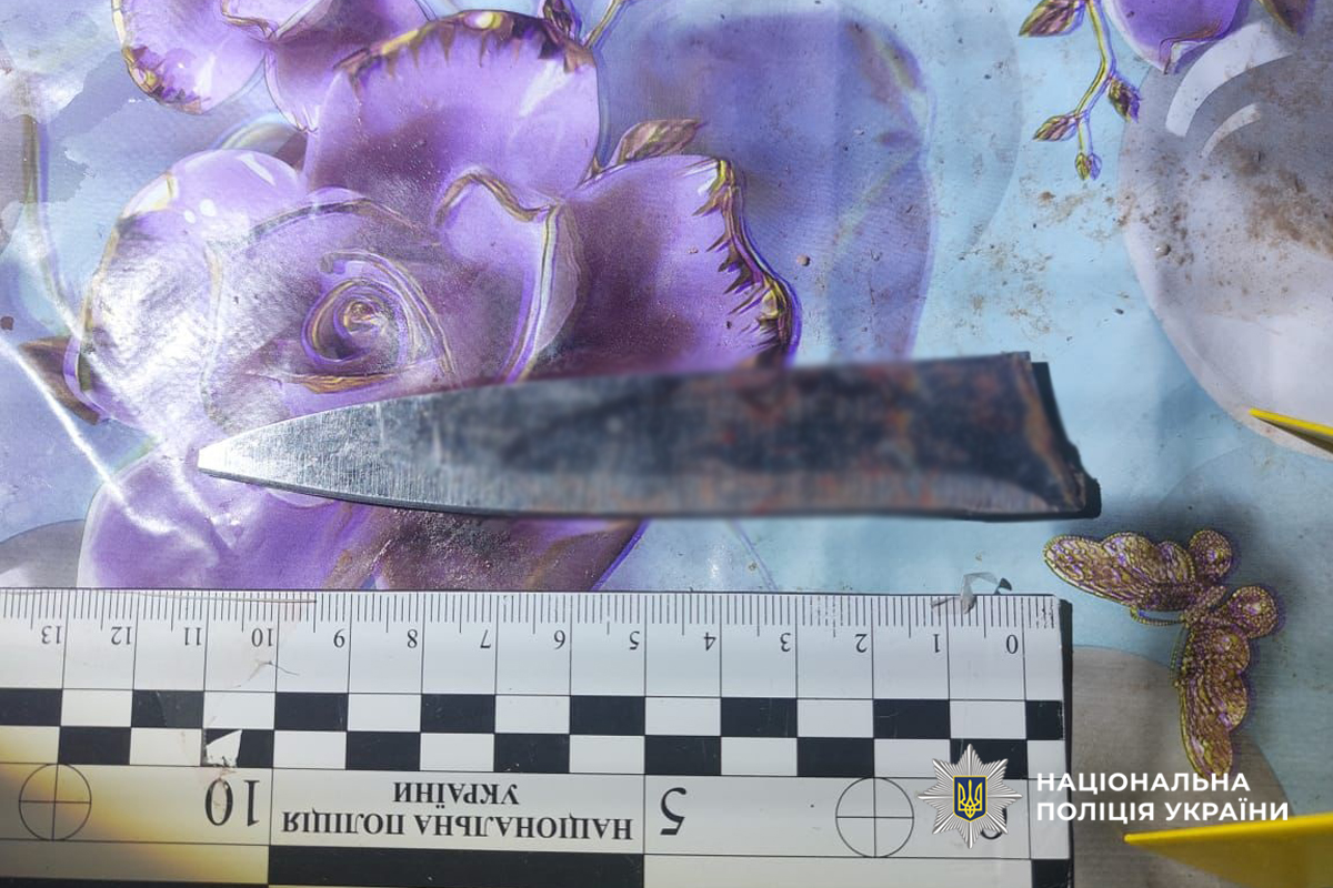 Під час огляду будинку, у якому мешкала потерпіла, та на території домоволодіння поліцейські виявили речові докази, а також знаряддя злочину — ніж.