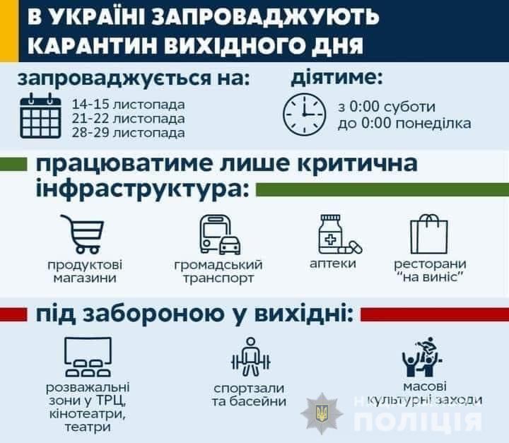 Варто наголосити, що відповідно до постанови Уряду №1100 протягом вихідних, починаючи з 14 листопада й до кінця місяця, заклади харчування, магазини, окрім продуктових, ТРЦ, спортзали підлягають закриттю або не повинні приймати відвідувачів. Також скасовуються всі масові заходи.