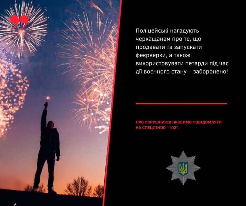 Поліцейські нагадують черкащанам про те, що продавати та запускати феєрверки та використовувати петарди під час дії воєнного стану – заборонено. Про порушників просимо повідомляти на спецлінію “102”.