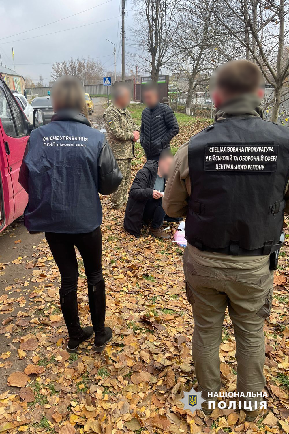 4 листопада, після одержання неправомірної вигоди у сумі 2600 доларів США, правопорушника затримали працівники Черкаської спеціалізованої прокуратури у військовій та оборонній сфері спільно зі слідчими відділу розслідування особливо тяжких злочинів слідчого управління ГУНП в Черкаській області на місці вчинення кримінального правопорушення.