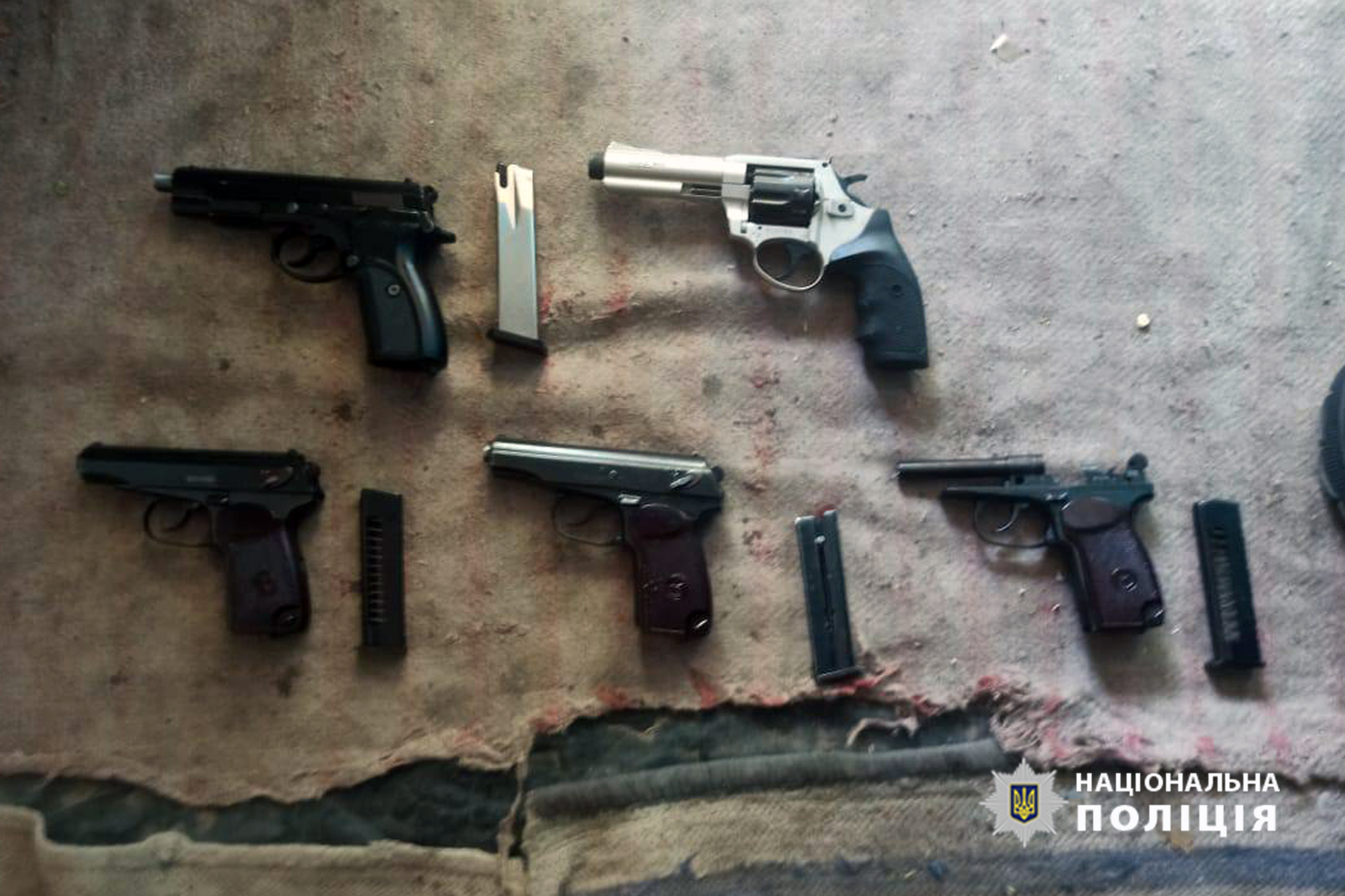 Під час проведення санкціонованого обшуку за місцем проживання фігуранта, поліцейські виявили та вилучили револьвер, 4 пістолети з магазинами до кожного, набої та додаткові магазини.