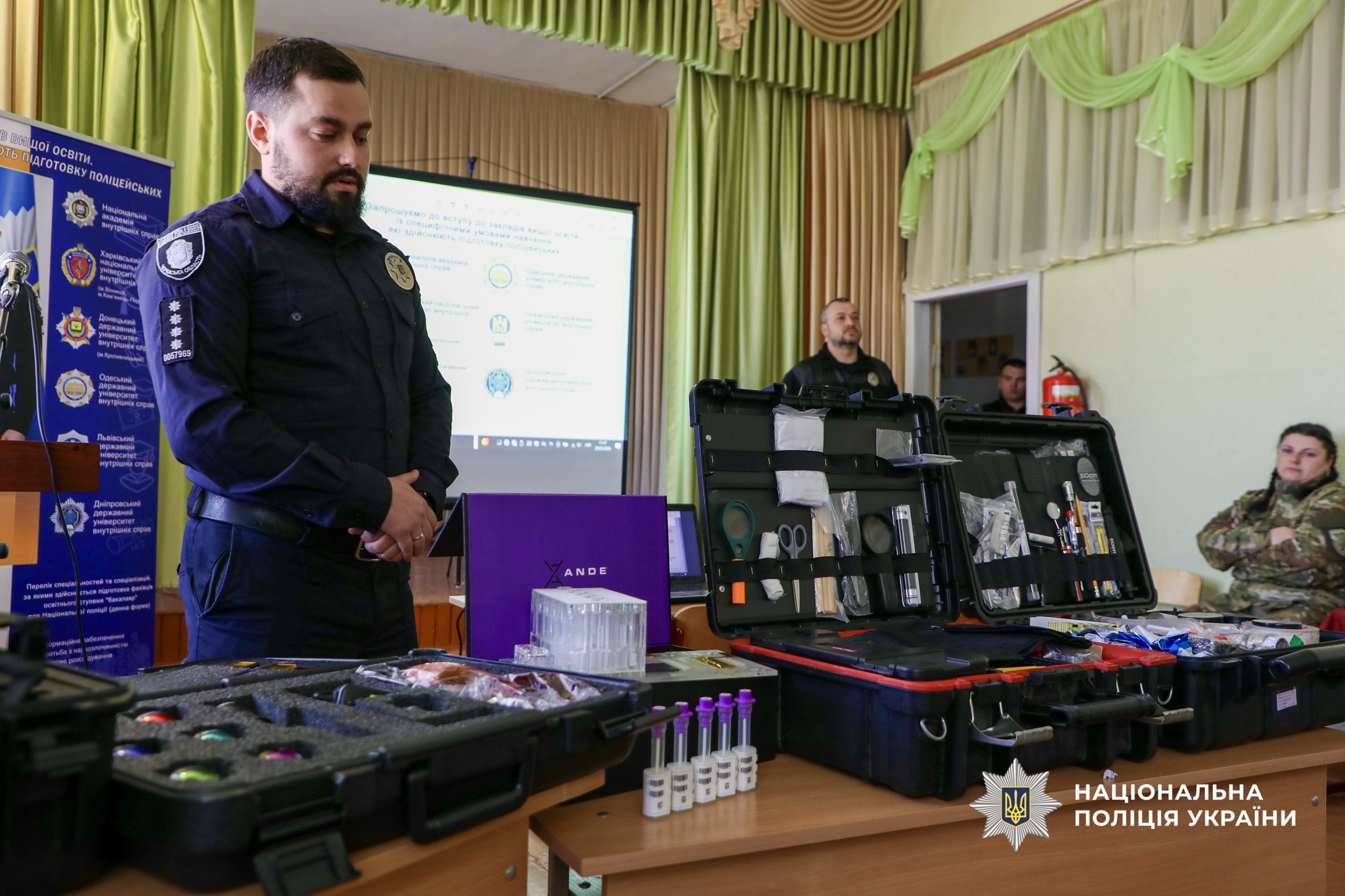 Старший спеціаліст-криміналіст ознайомив школярів із вмістом криміналістичних валіз, розповів про особливості огляду місця події, пошук та фіксацію слідів, а також про можливості сучасної криміналістичної лабораторії.