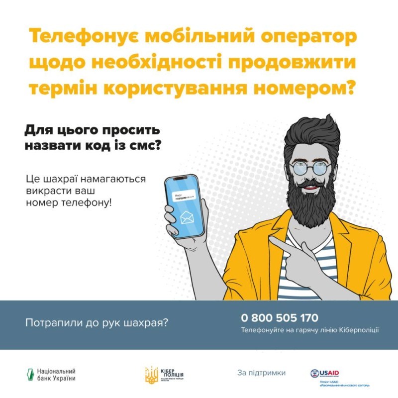 Часто шахраї діють від імені працівників мобільного оператора. Вони просять продиктувати код із смс-повідомлення від мобільного оператора. Пам’ятайте, працівники мобільних операторів ніколи не запитують коди з смс-повідомлень.