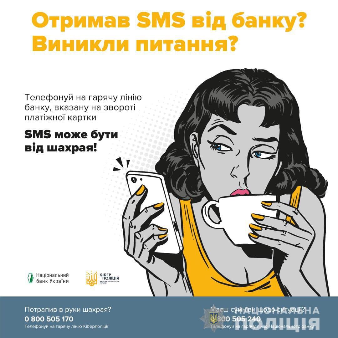 Одна з найпоширеніших схем шахрайських дій. Шахраї шлють СМС потенційним жертвам з повідомленням про блокування вашої банківської картки для розблокування якої, рекомендують перетелефонувати на визначений номер. Після чого в ході розмови, мотивуючи перевіркою та ідентифікацією клієнта, випитують необхідні для зняття коштів данні, а саме: повний номер банківської картки, термін дії та CVV код (3 цифри на зворотньому боці картки). Ці всі дані у жодному разі не можна повідомляти стороннім, бо знаючи необхідну інформацію злочинці легко здійснють заволодіння коштами довірливих громадян. (особам похилого віку, які не здійснюють розрахунки в мережі інтернет, взагалі рекомендуємо стерти CVV код аби вони не змогли назвати його шахраям).