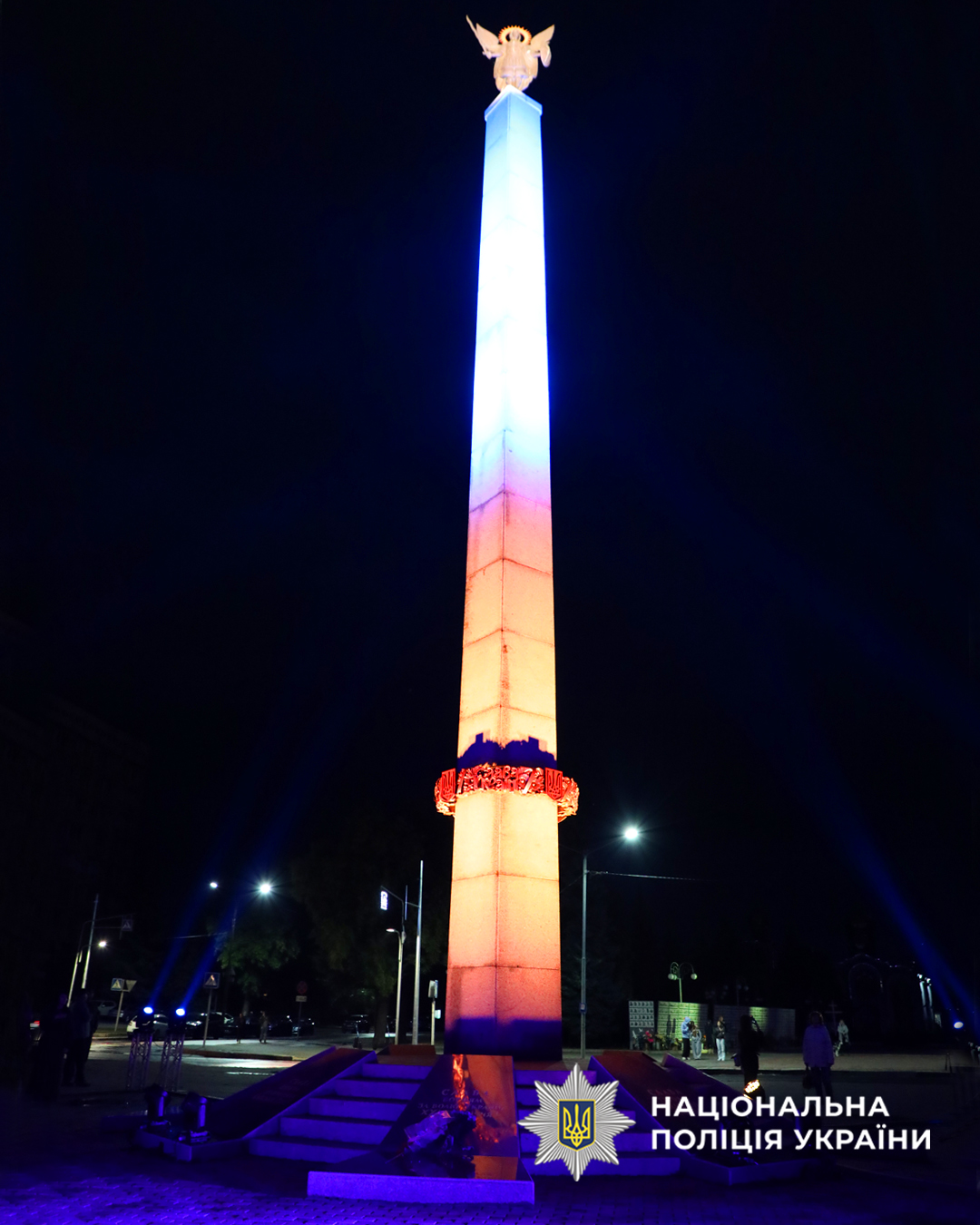 Під виконання Гімну України, монументи підсвітили синьо-жовтим прапором. Символ існування Української держави та незламності українців.