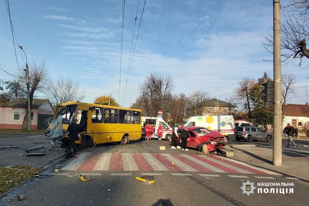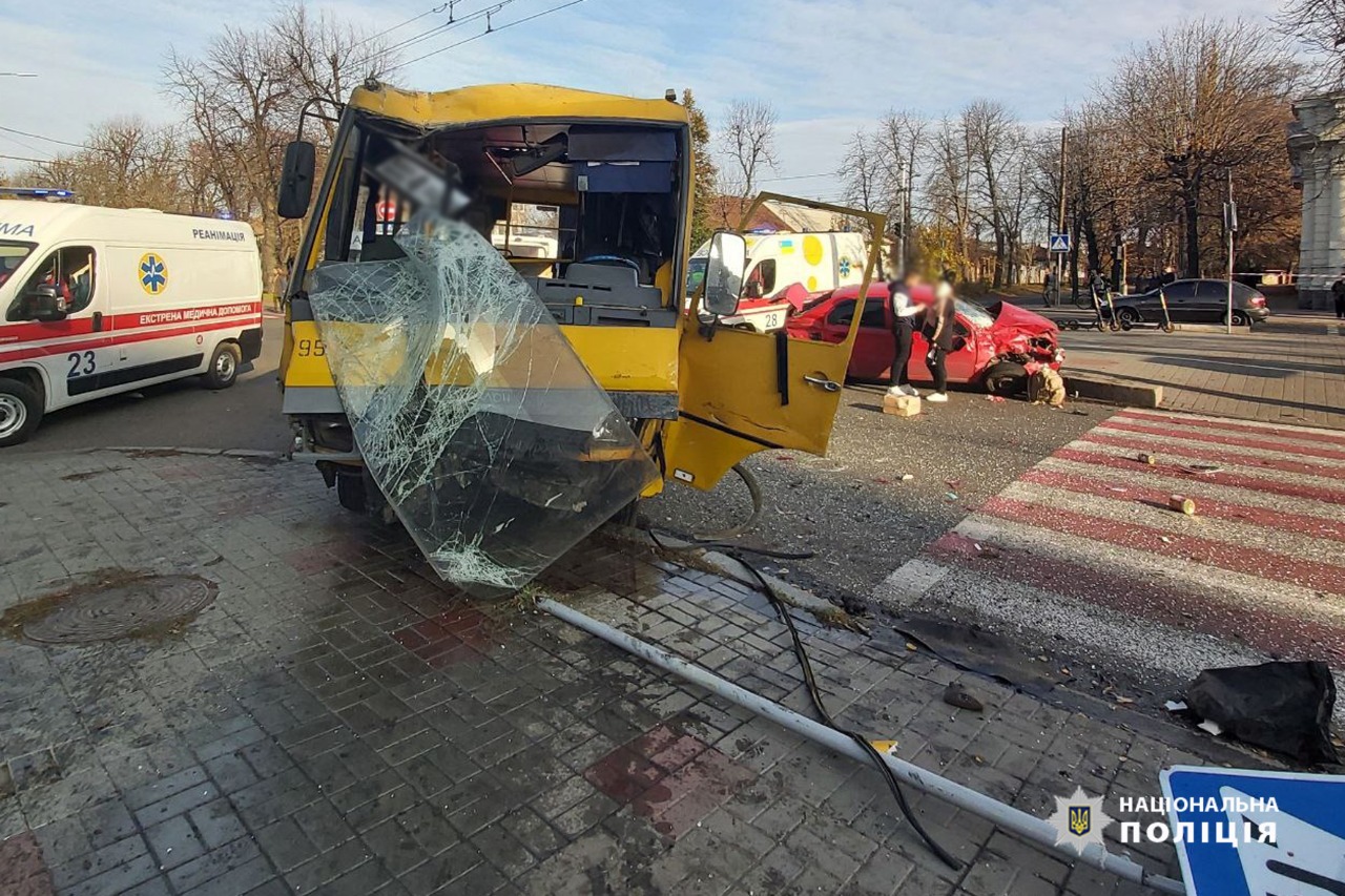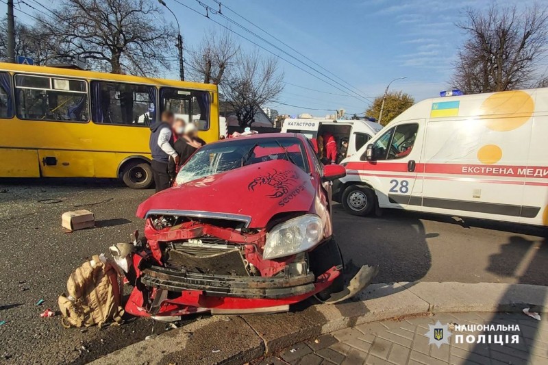 Як попередньо встановили правоохоронці, 52-річна кермувальниця автомобіля Chevrolet Aveo рухаючись по бульварі Шевченка на зелений сигнал світлофора, здійснила маневр повороту ліворуч та не надала перевагу у русі маршрутному автобусу «БАЗ» під керуванням 46-річного водія.