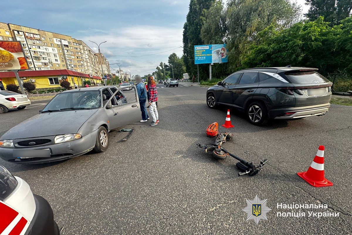 Як попередньо встановили поліцейські, водій електросамоката повертаючи ліворуч до прилеглої території, допустила зіткнення з автомобілем «Ford Fiesta». Унаслідок аварії 37-річна керманич двоколісного отримала травми. Її госпіталізували до лікарні.