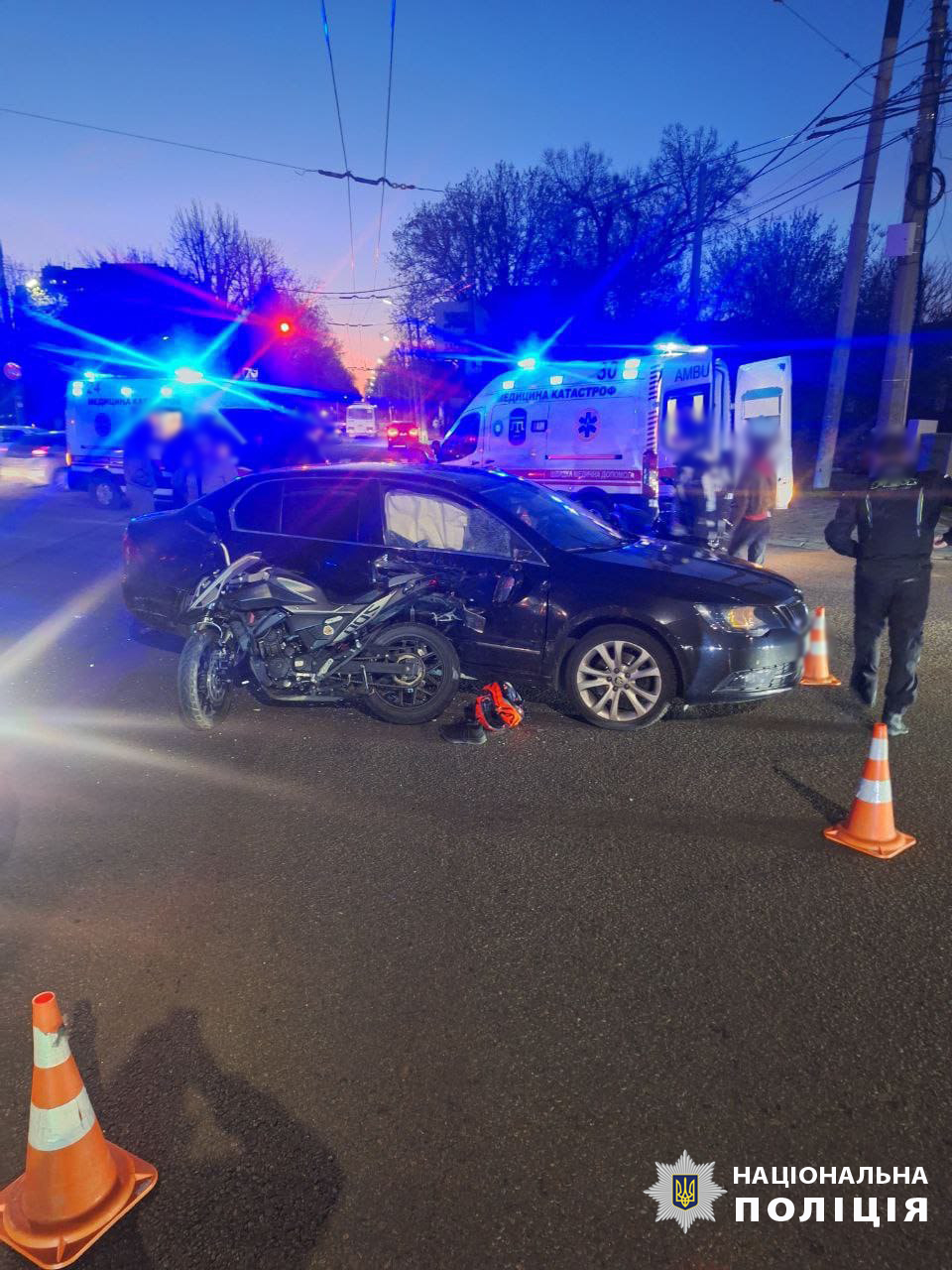 Як попередньо встановили поліцейські, зіткнення між авто та мотоциклом сталося тоді, коли 42-річний водій автомобіля Skoda повертаючи ліворуч в бік вулиці Припортової не надав переваги в русі мотоциклісту, який рухався бульваром Шевченка, можливо, на заборонений сигнал світлофора.