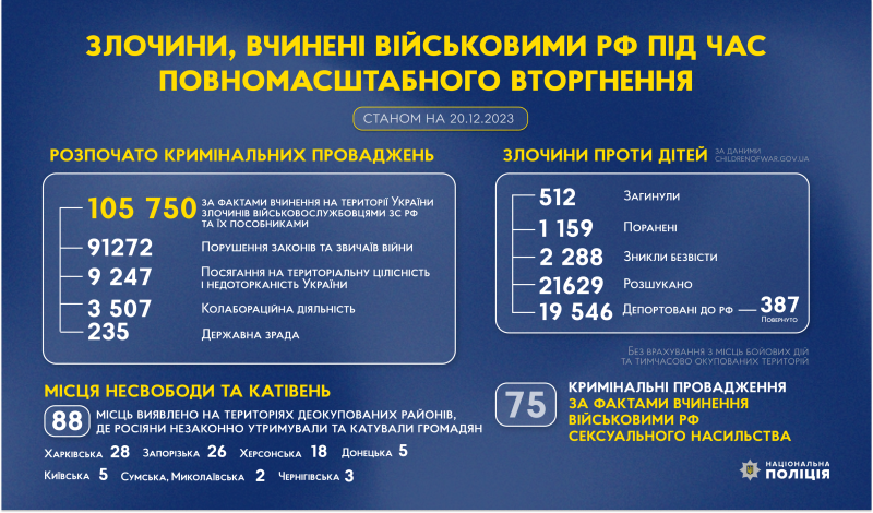 З початку повномасштабного вторгнення росії в Україну слідчі Національної поліції України розпочали 105 750 кримінальних проваджень за фактами вчинення на території України злочинів військовослужбовцями збройних сил російської федерації та їхніми пособниками.
