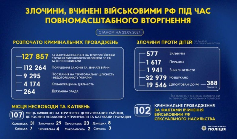 З початку повномасштабного вторгнення росії в Україну слідчі Національної поліції України розпочали 127 857 кримінальних проваджень за фактами вчинення на території України злочинів військовослужбовцями збройних сил російської федерації та їхніми пособниками.